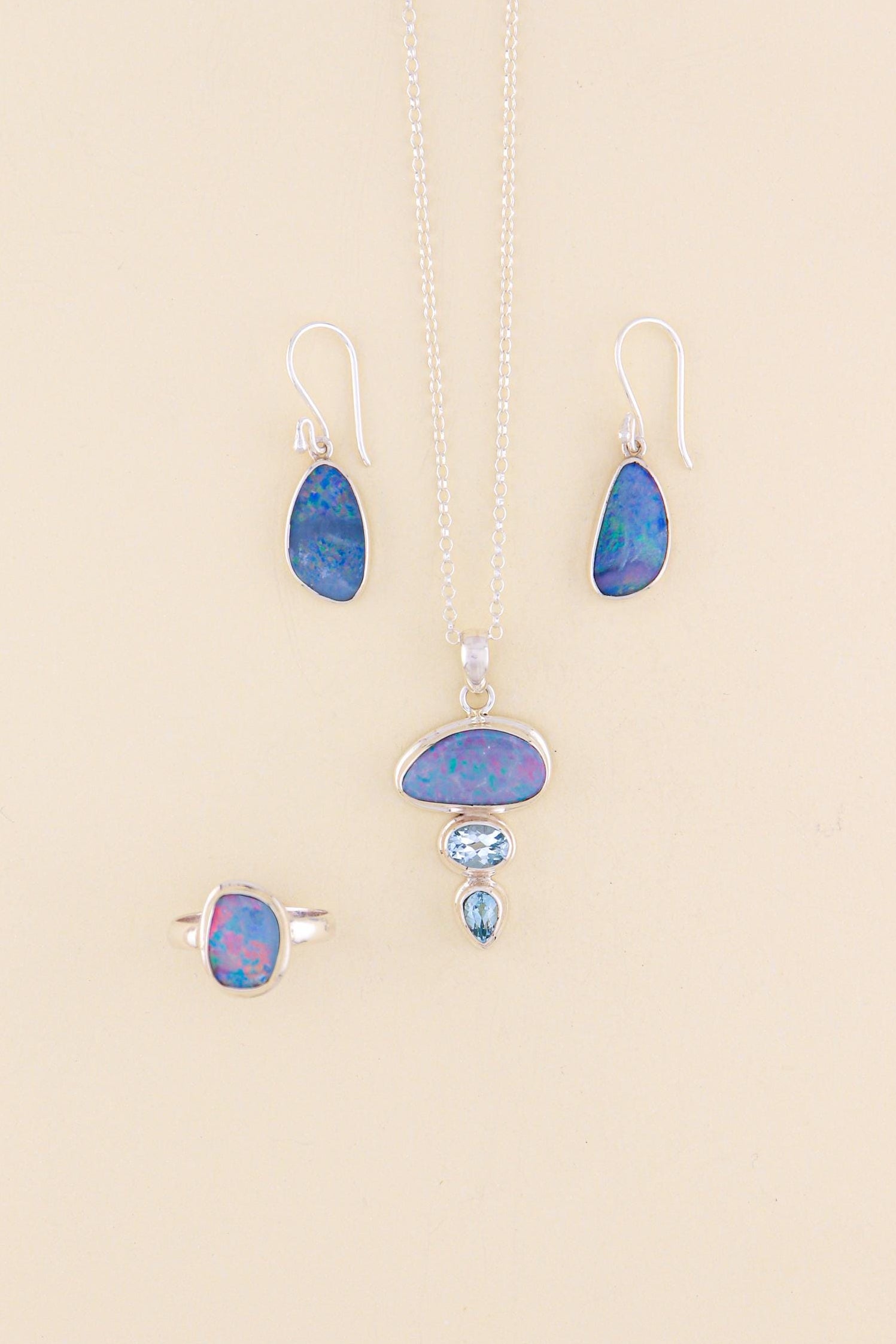 Beneath the opal, two sparkling blue topaz stones add brightness and clarity — one oval-cut, one teardrop-cut — creating a flowing line of cool, luminous colour. Together, the trio forms a balanced and eye-catching composition that feels both elegant and contemporary.