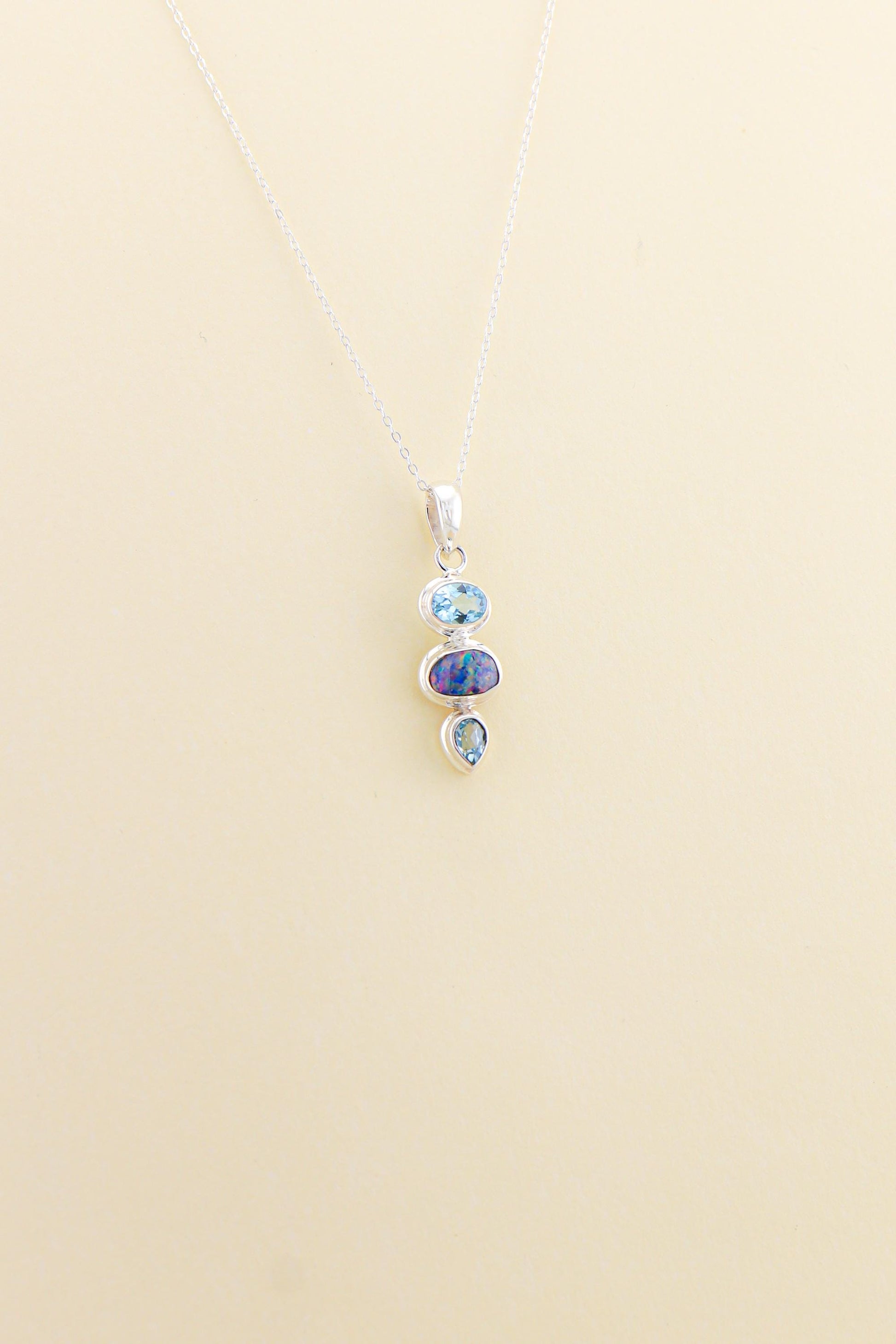This elegant vertical trio pendant blends sparkling topaz with the rich colours of natural opal, creating a refined and eye-catching piece.
