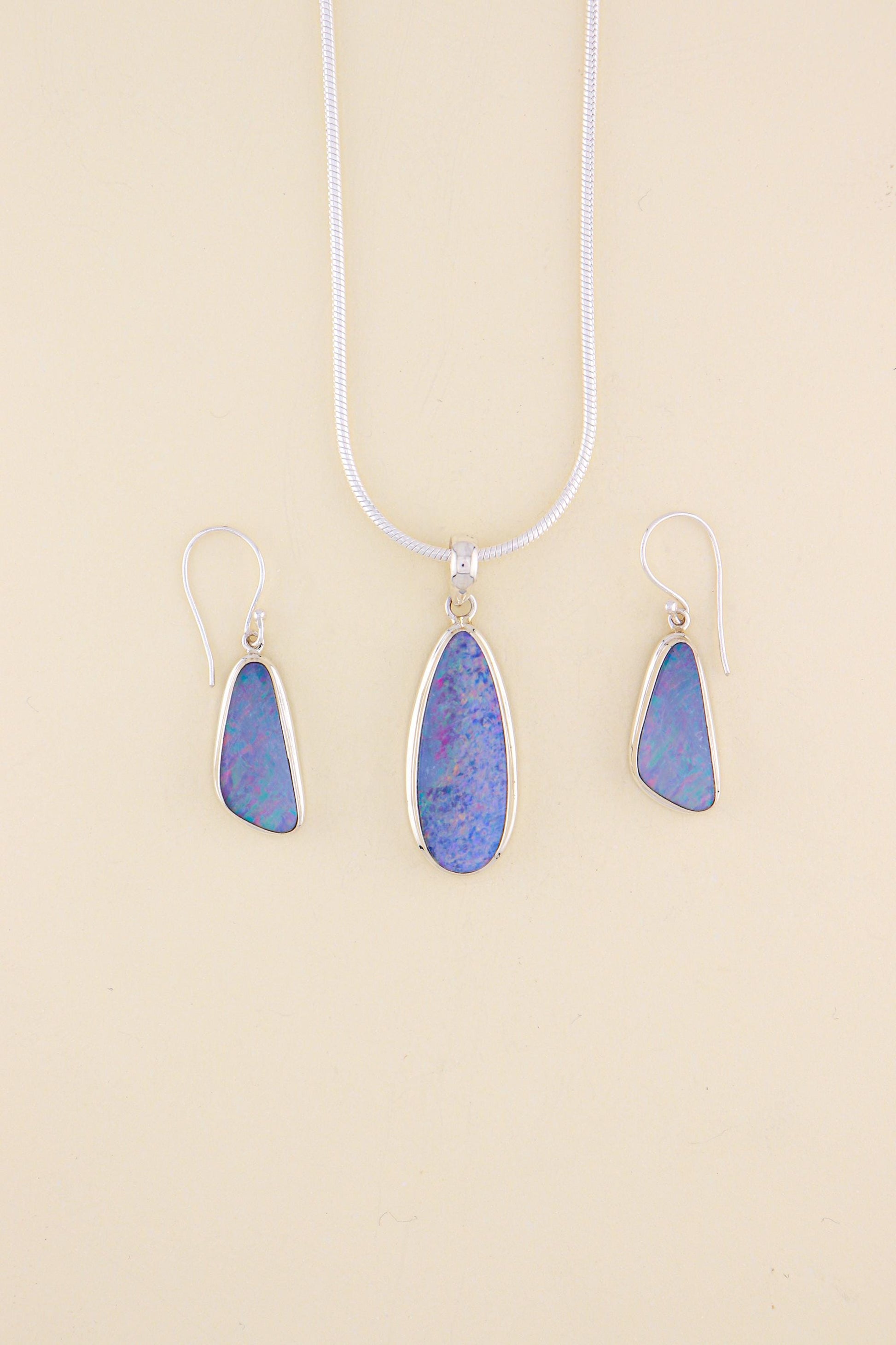 The opal displays a gorgeous blend of soft blues, purples, and subtle pink flashes, creating a dreamy pastel play of colour that shifts beautifully in the light.
