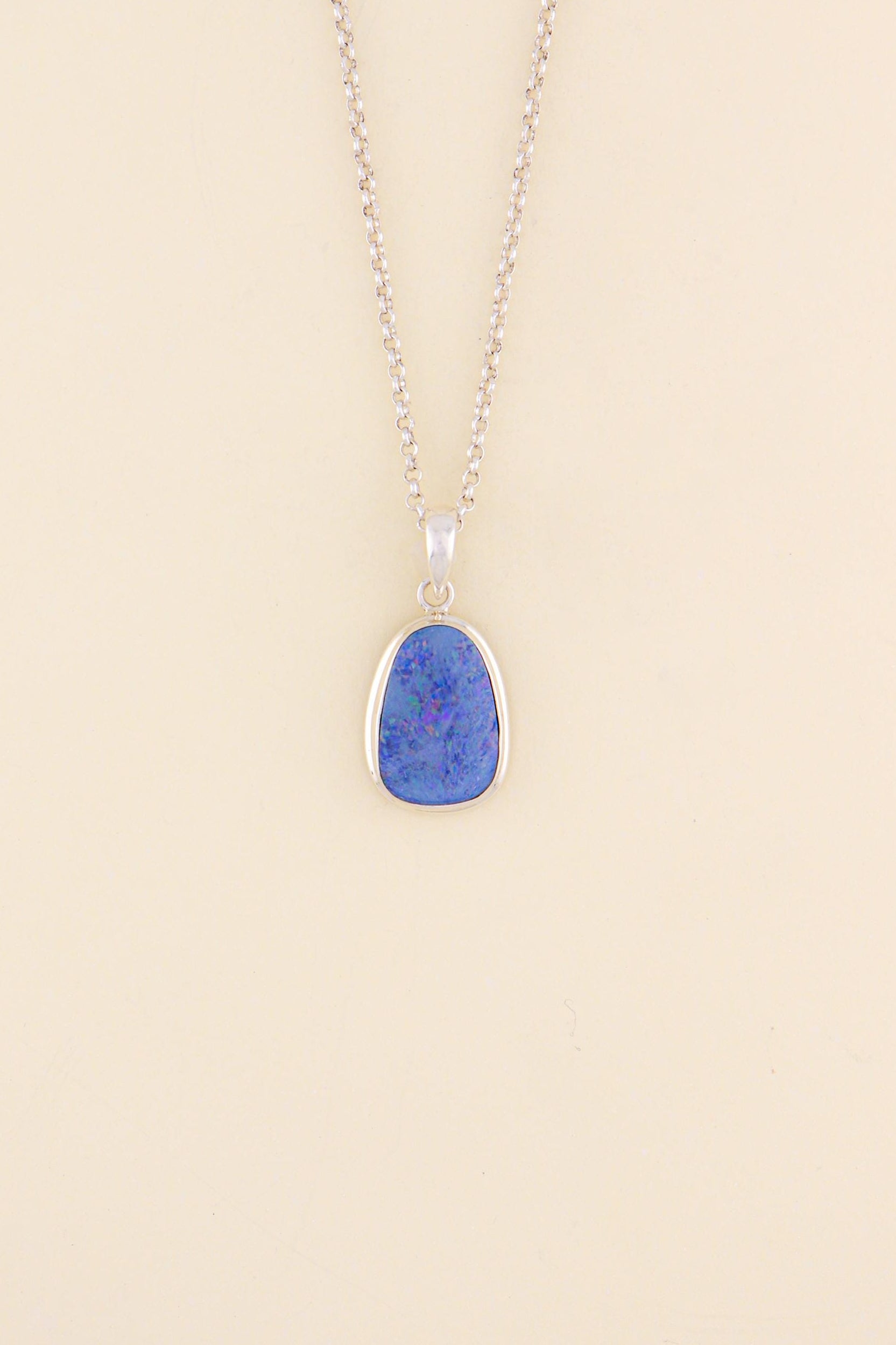 The opal displays a gorgeous blend of soft blues, purples, and subtle pink flashes, creating a dreamy pastel play of colour that shifts beautifully in the light.
