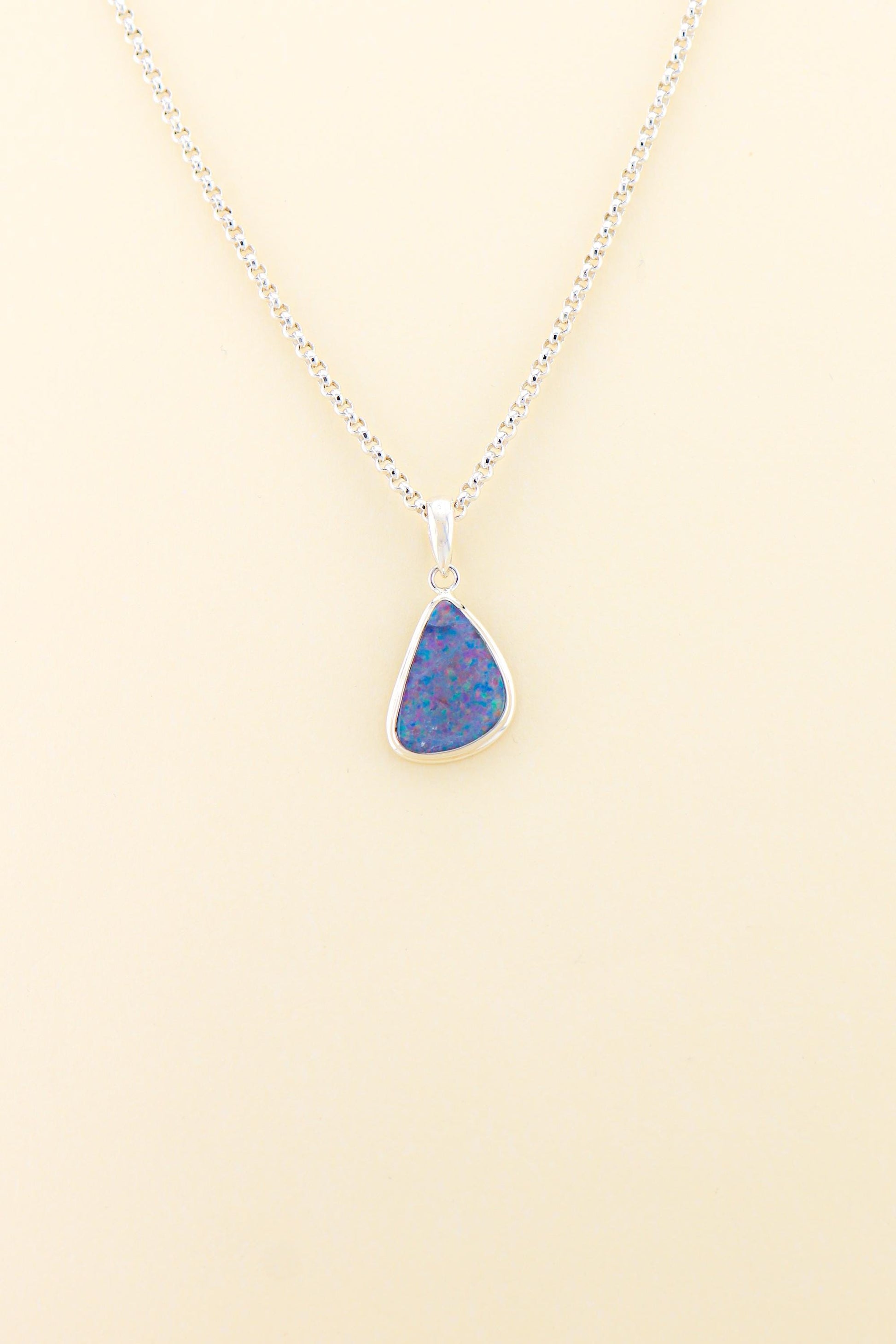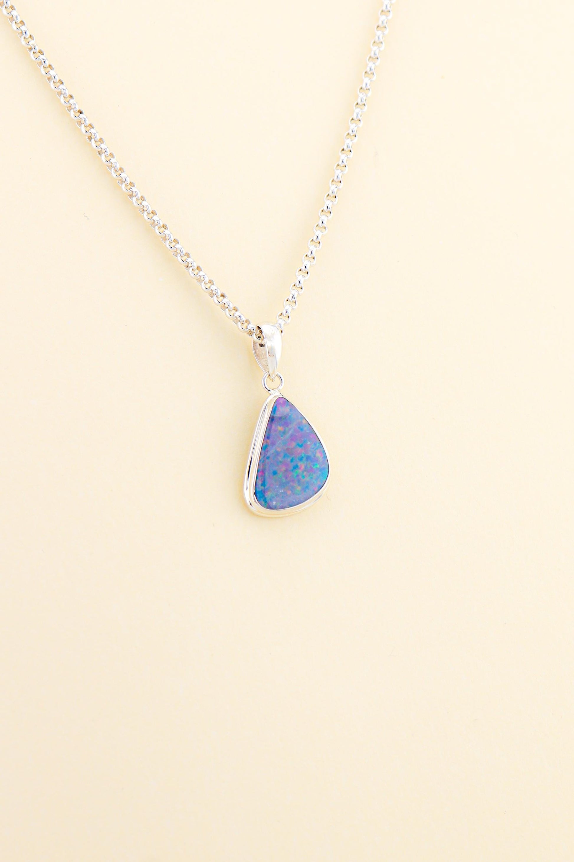 The opal shows a beautiful blend of blue, purple, and teal tones, creating a soft yet vibrant play of colour that shifts gently with the light. Very high quality stone, deep blue, full red fire when put in direct light.