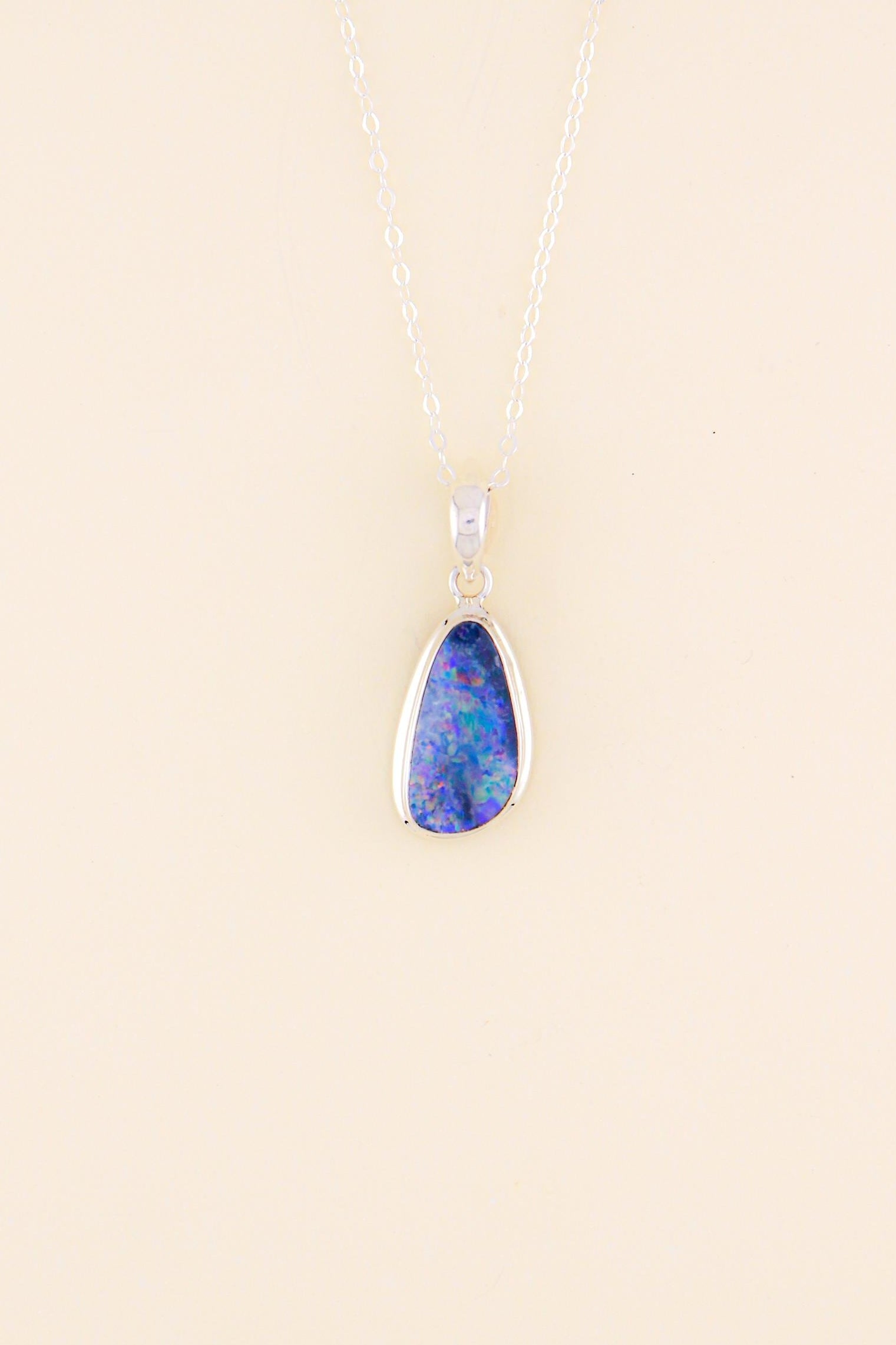 Add a touch of vibrant natural colour to your jewellery collection with this elegant freeform opal pendant set in solid 925 sterling silver.