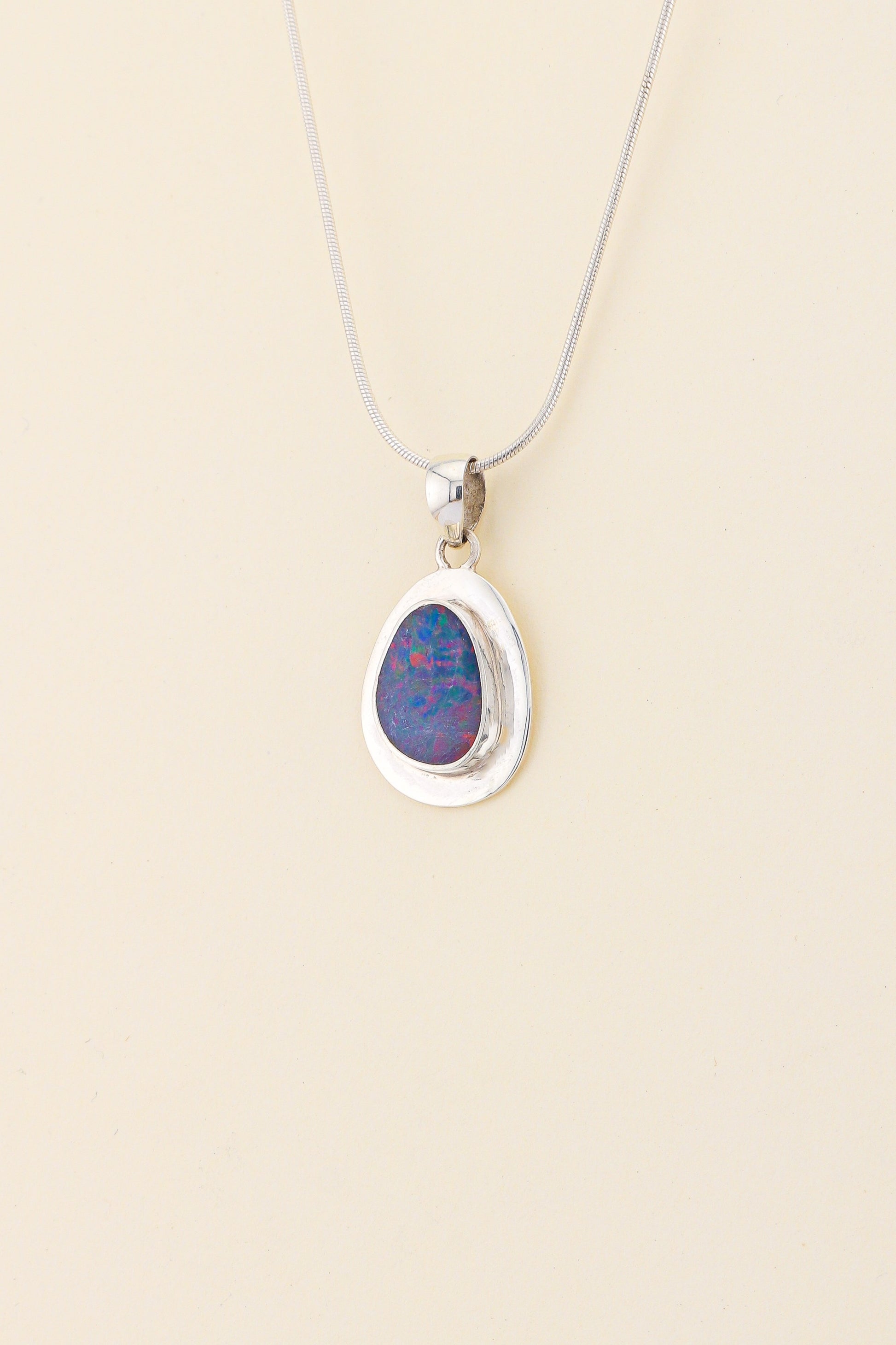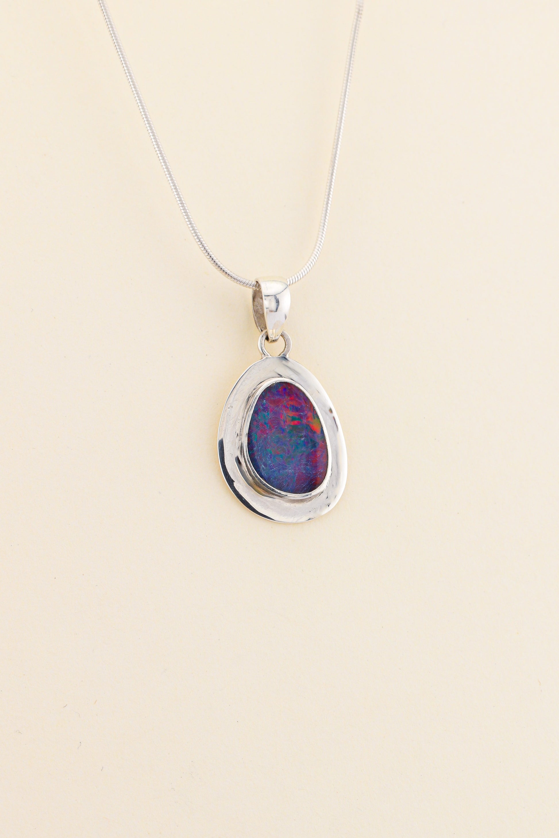 The free form Australian Opal pendant shows deep pink light coming through the dark blue stone. The stone is set on a 925 sterling silver bezel.