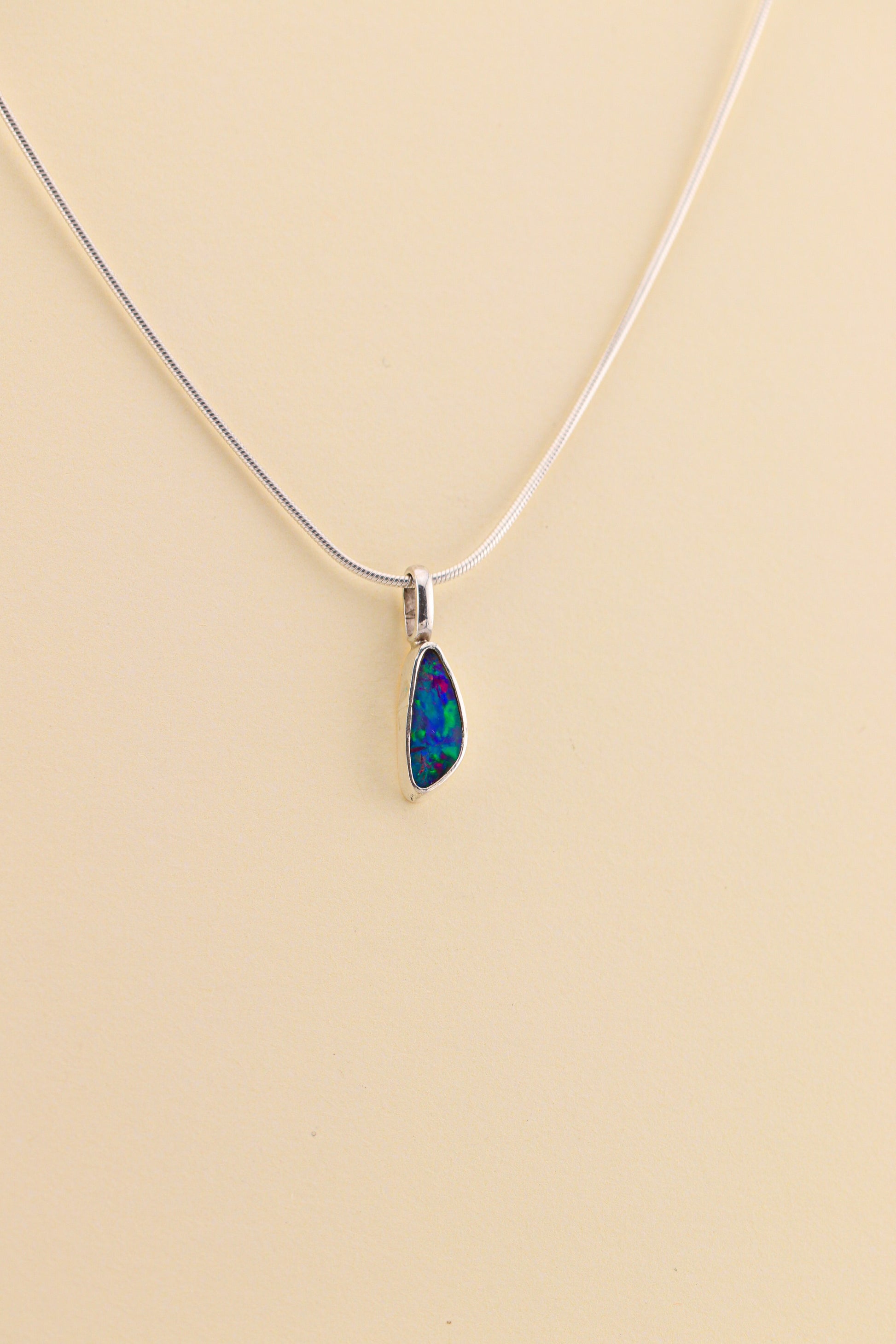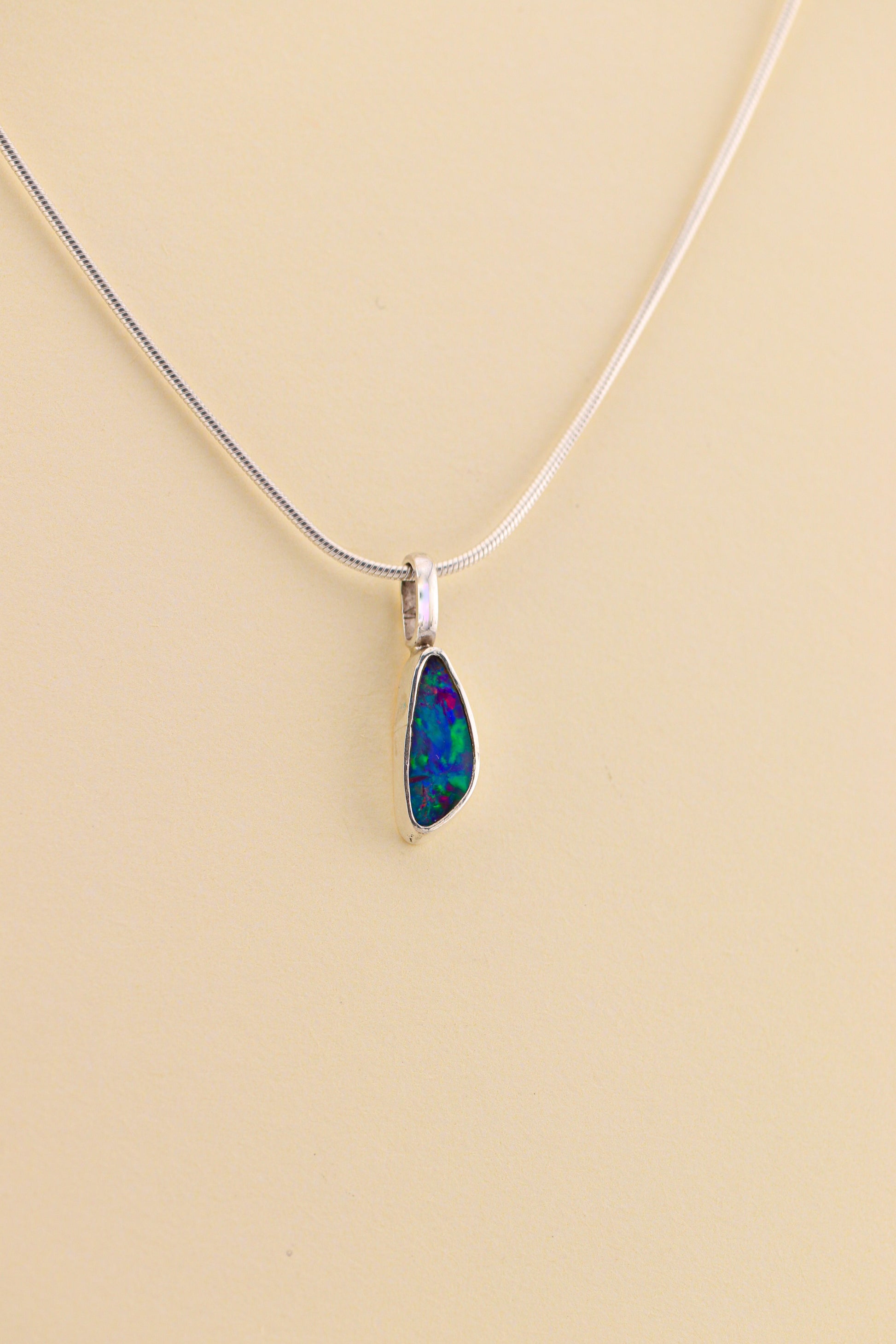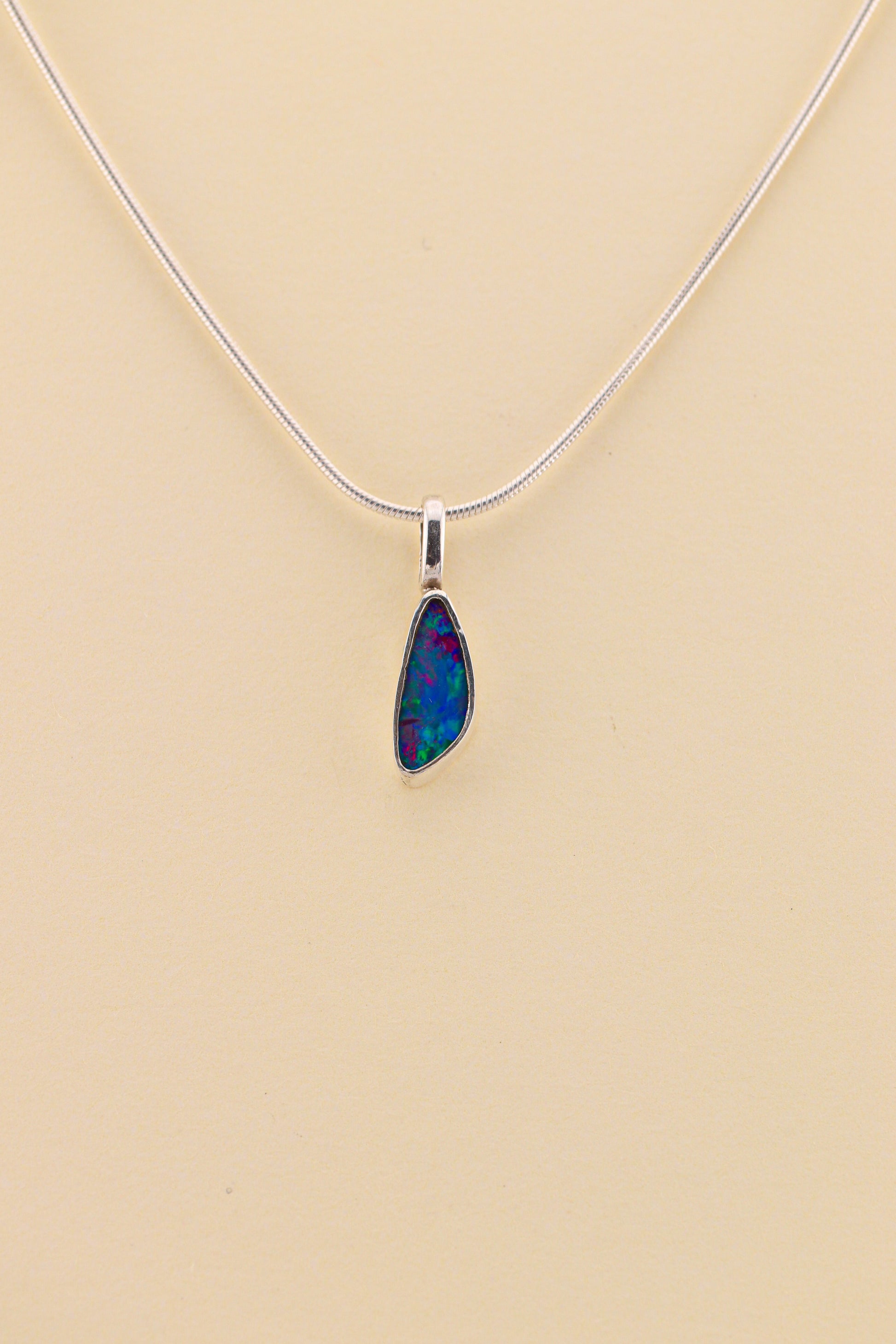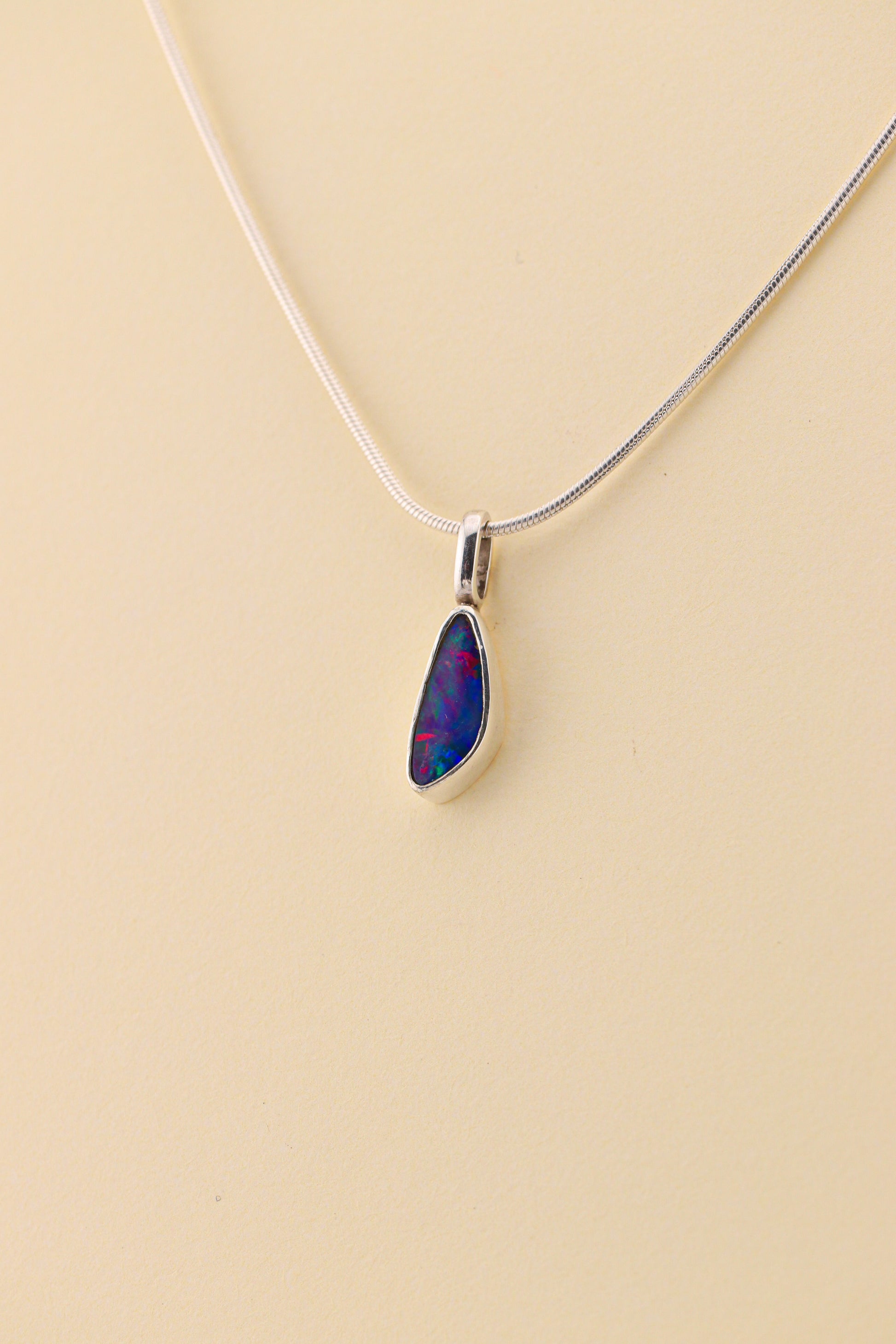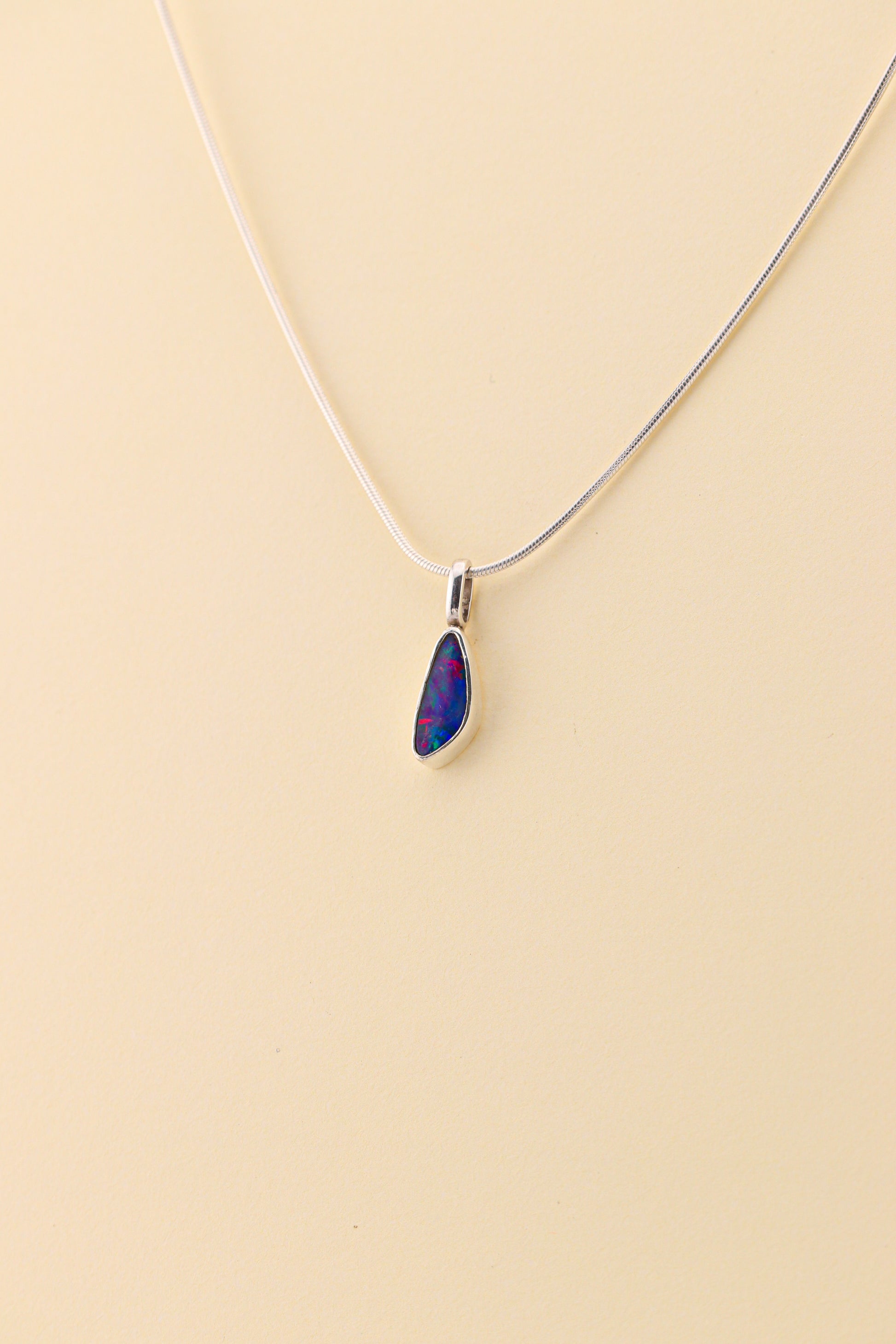 The free form Australian Opal pendant shows deep pink and green light coming through the dark blue stone. The stone is set on a 925 sterling silver bezel.