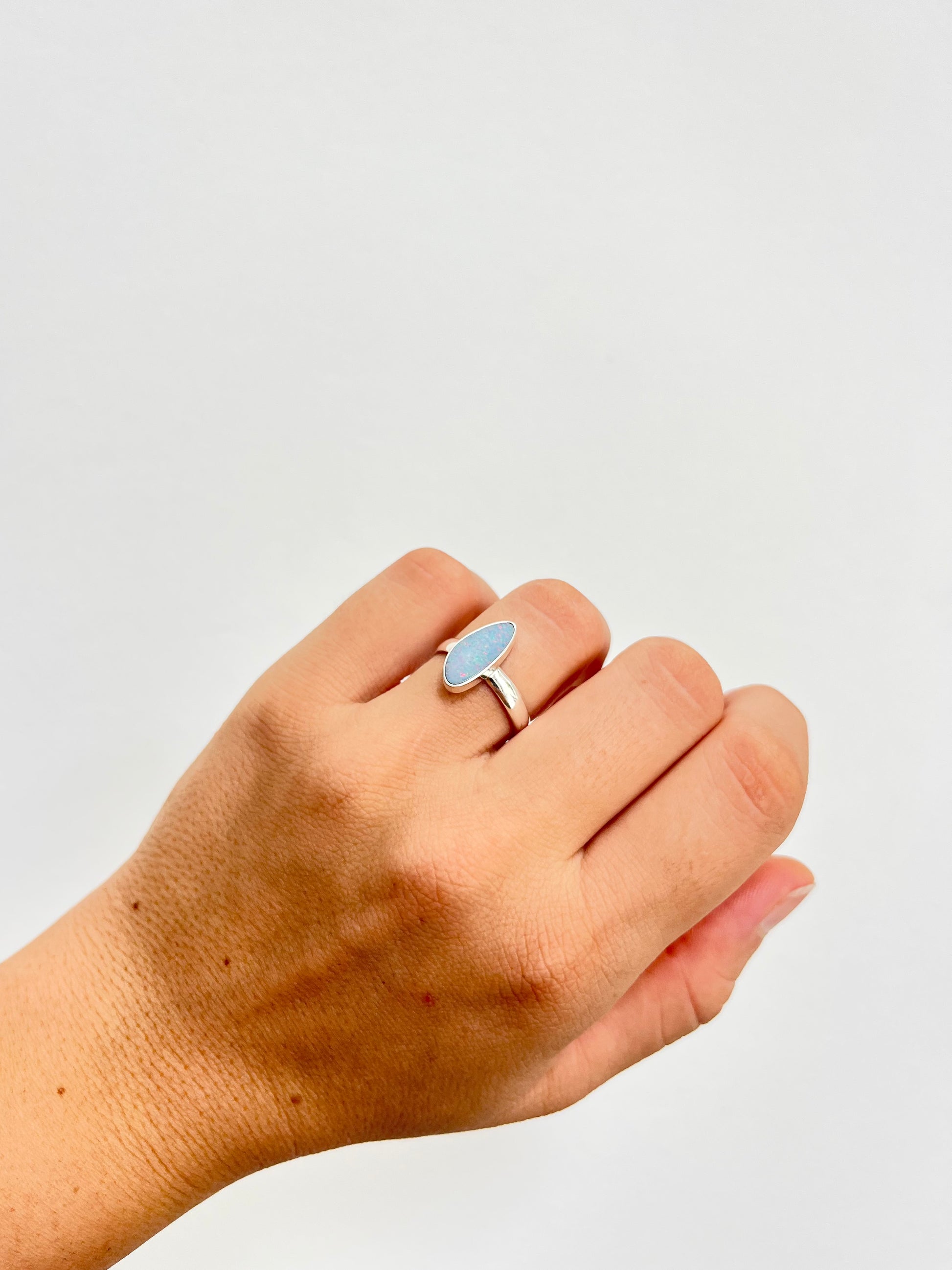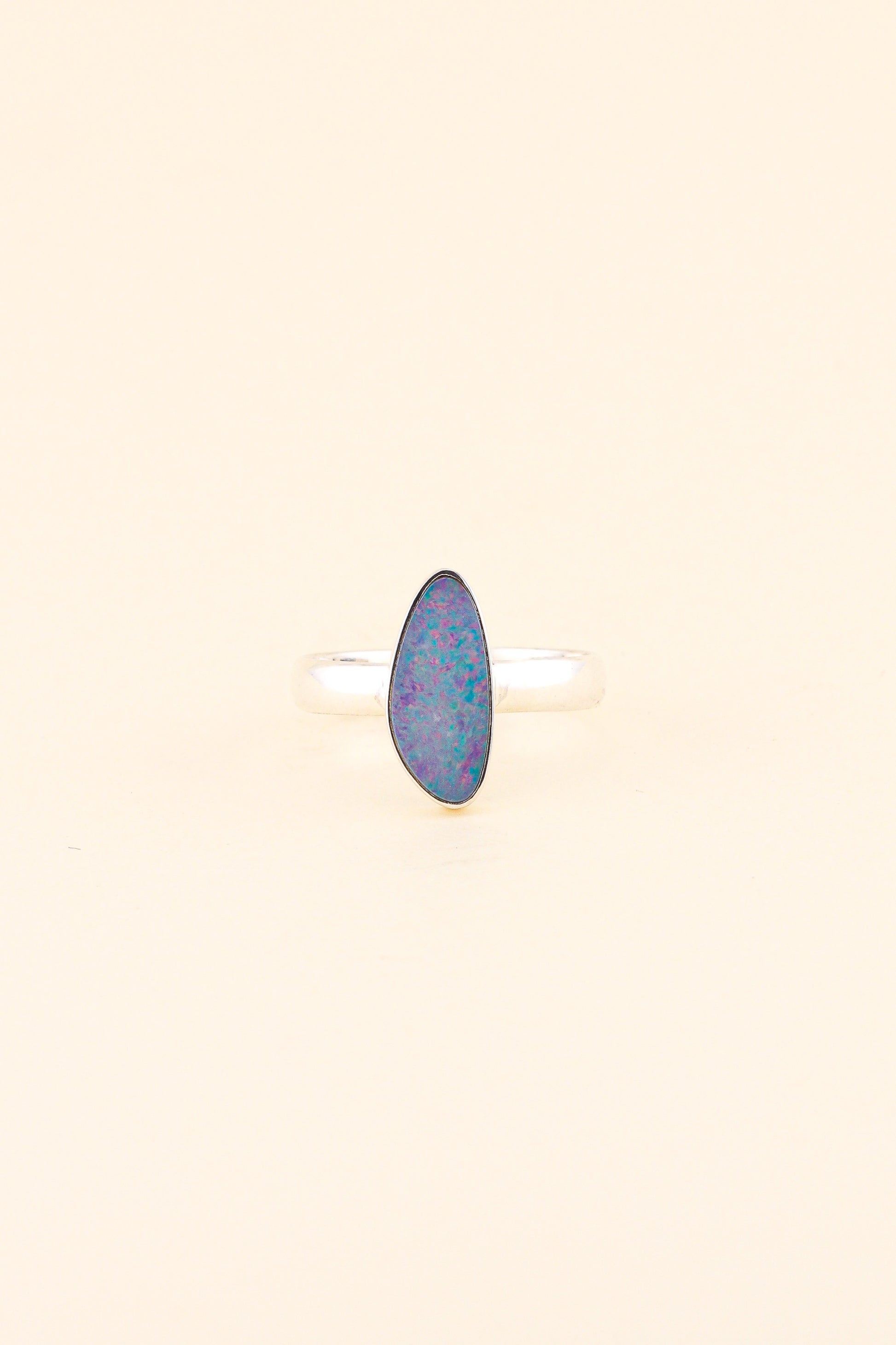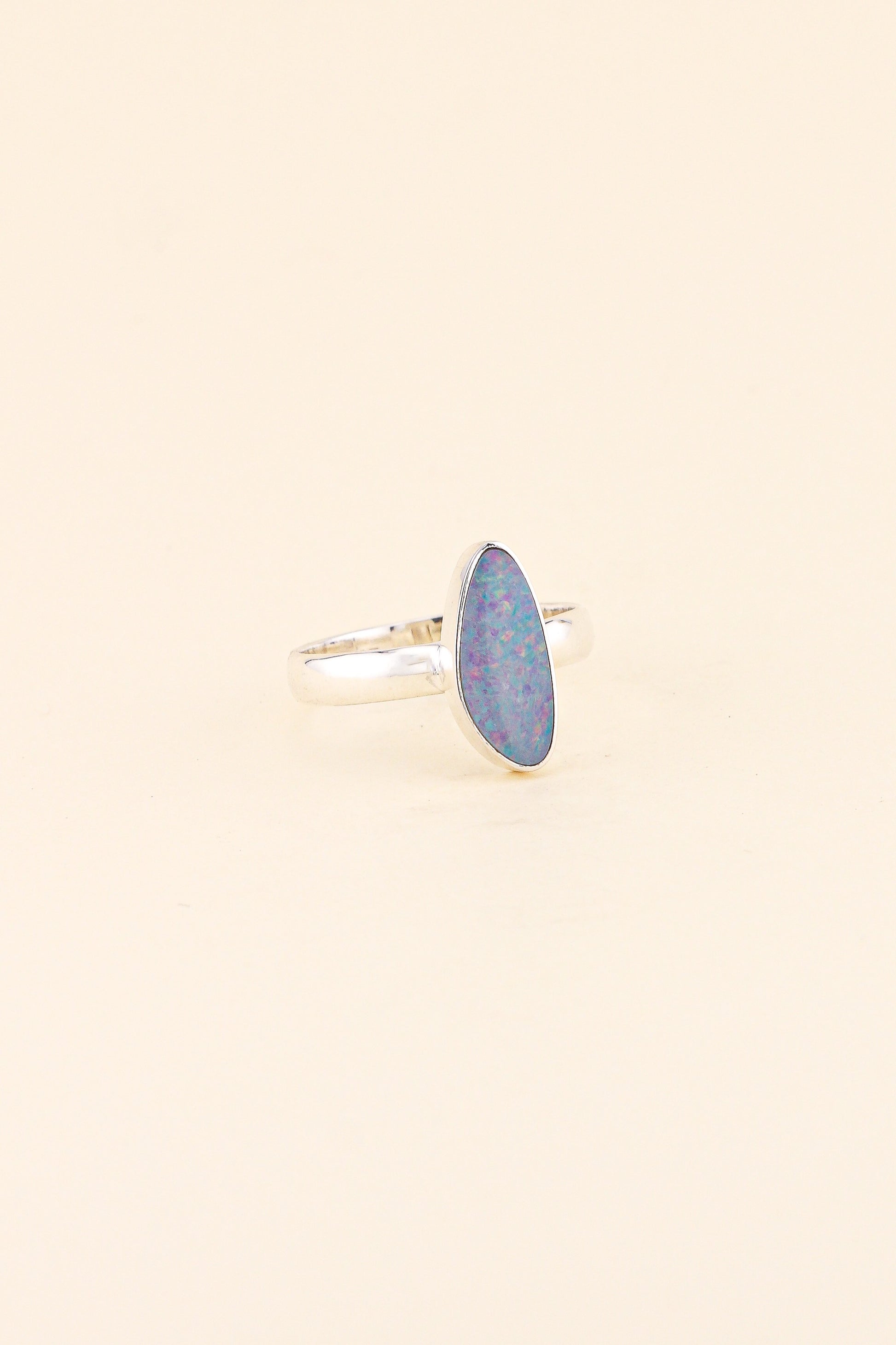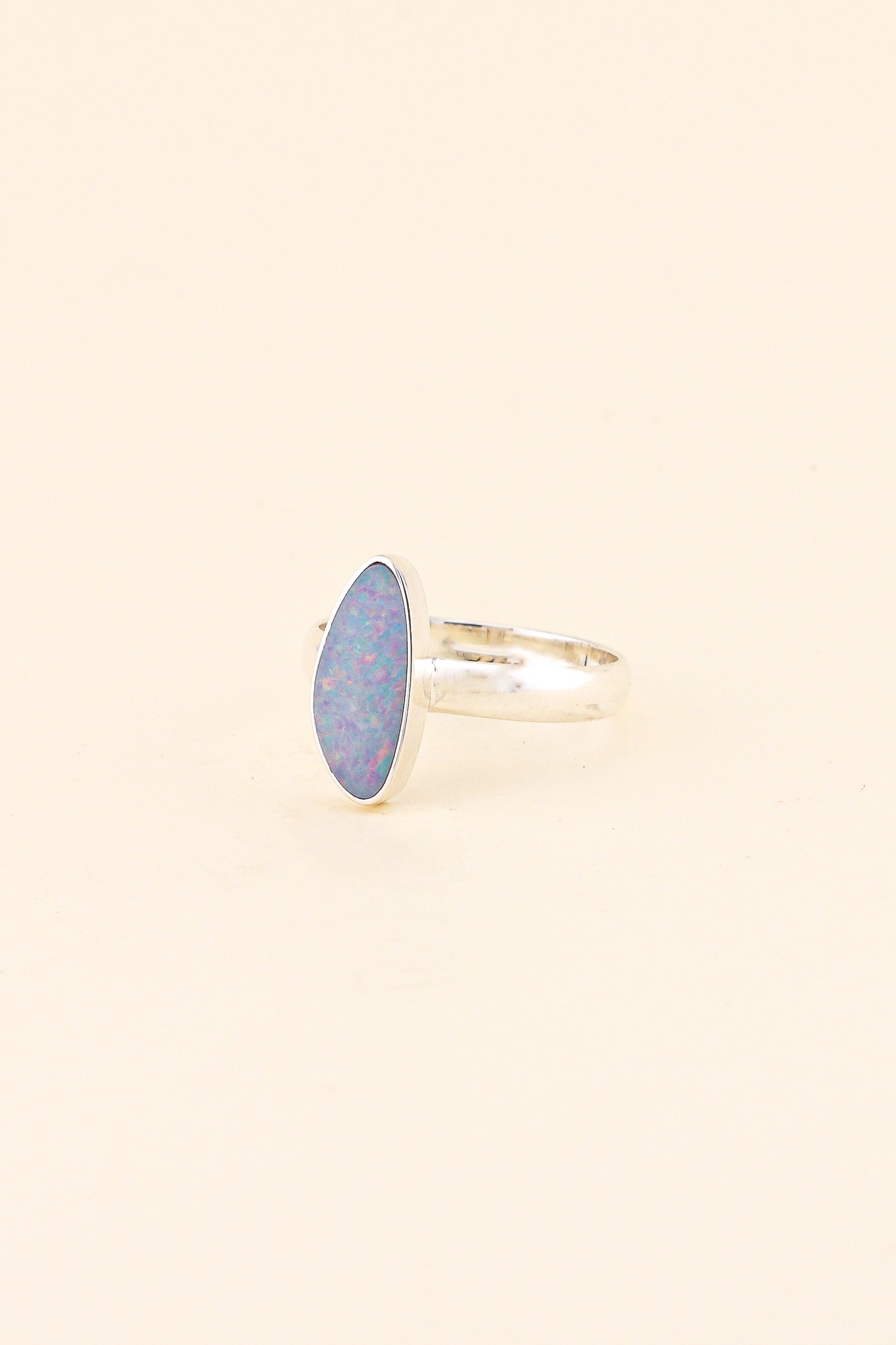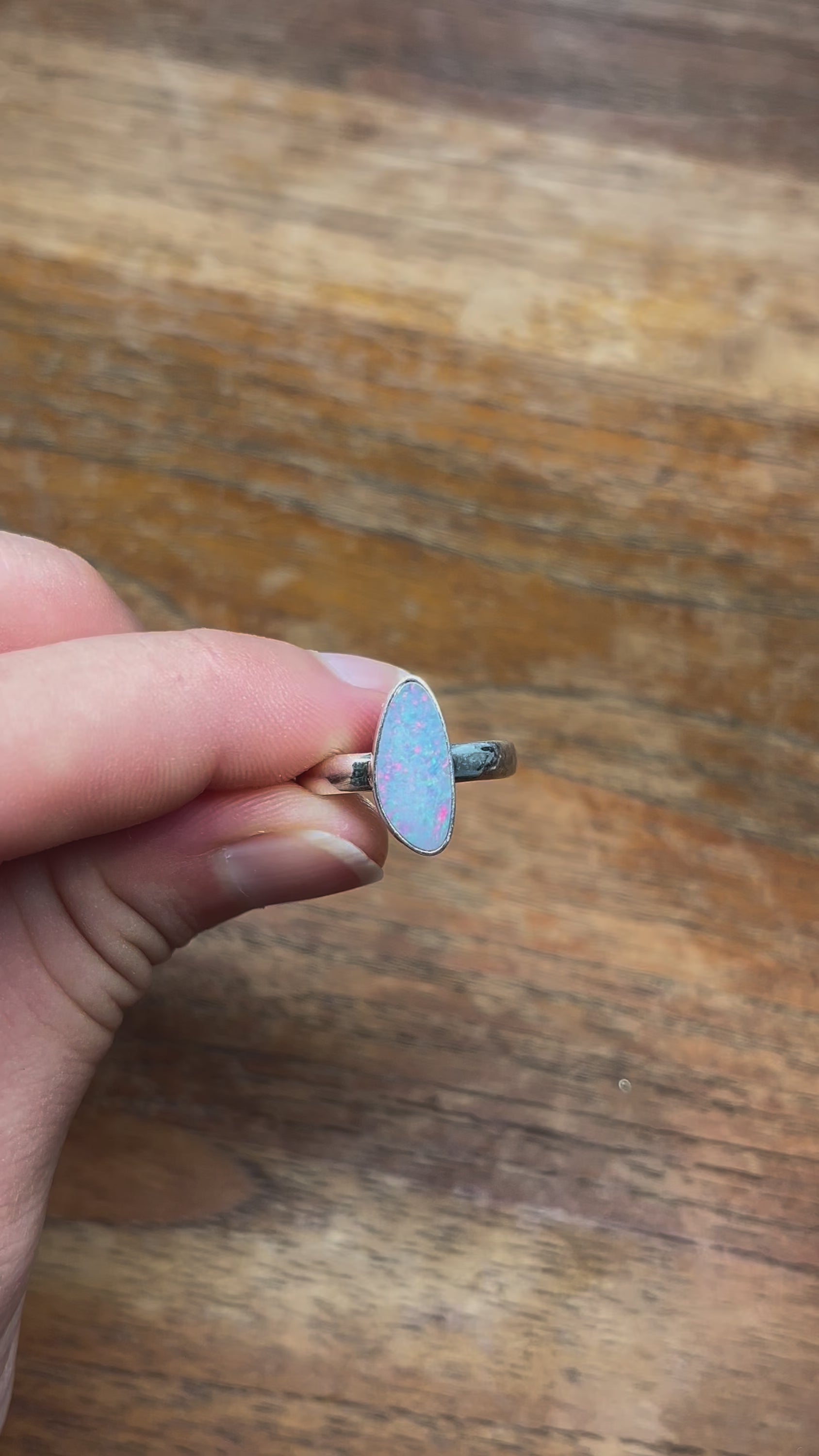 The free form Australian Opal stone shows powerful pink light coming through that we call "fire". The stone is set on a 925 sterling silver bezel.