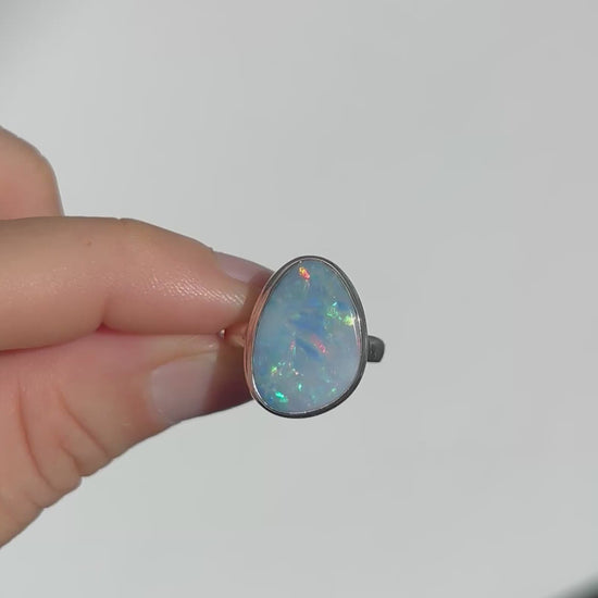 Large Australian Opal showing soft colors yet sparkling and eye catching. The stone is set on a 925 sterling silver double bezel.