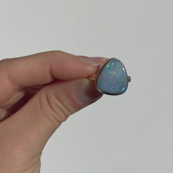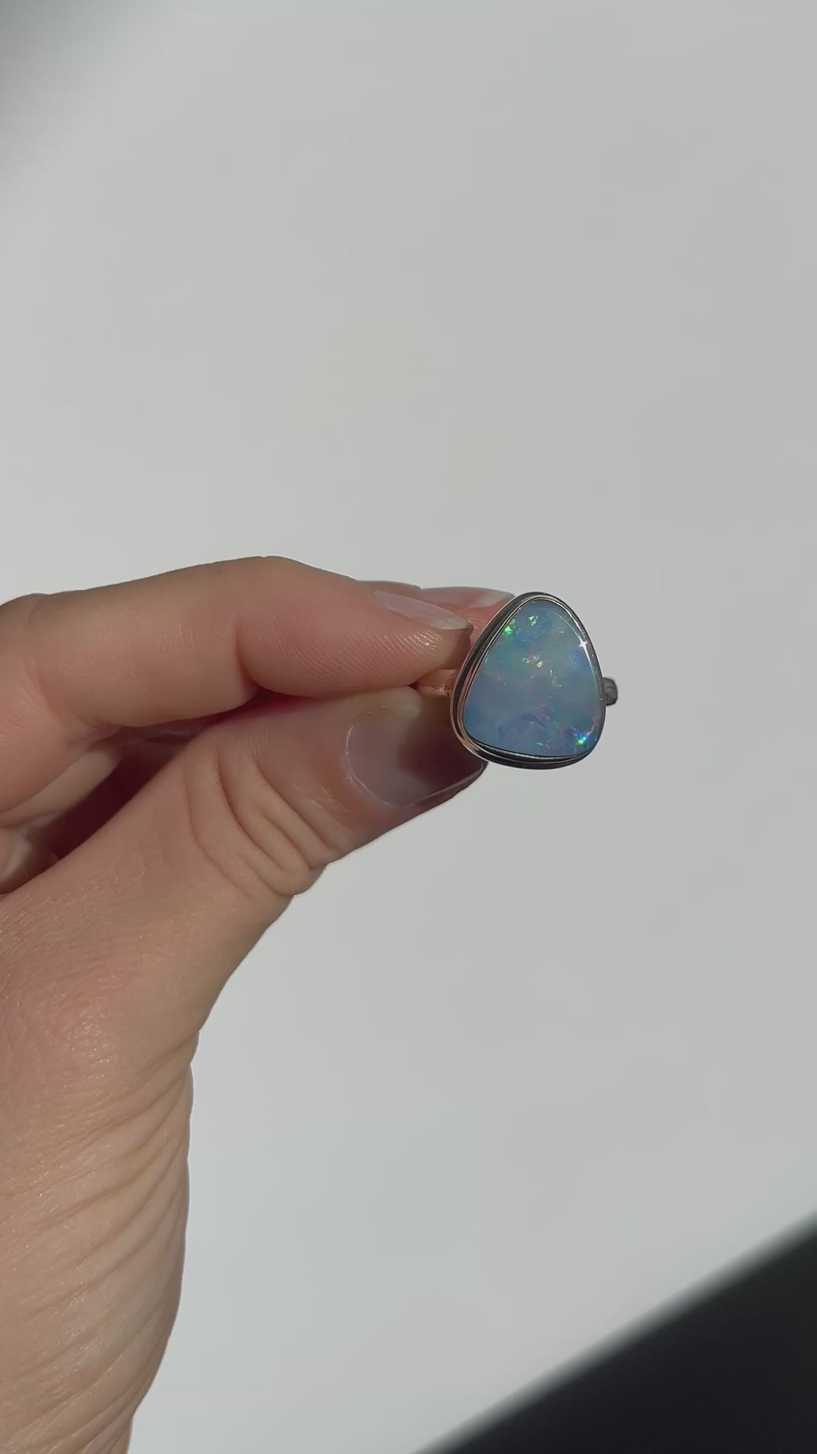 Large Australian Opal showing soft colors yet sparkling and eye catching. The stone is set on a 925 sterling silver double bezel.