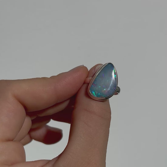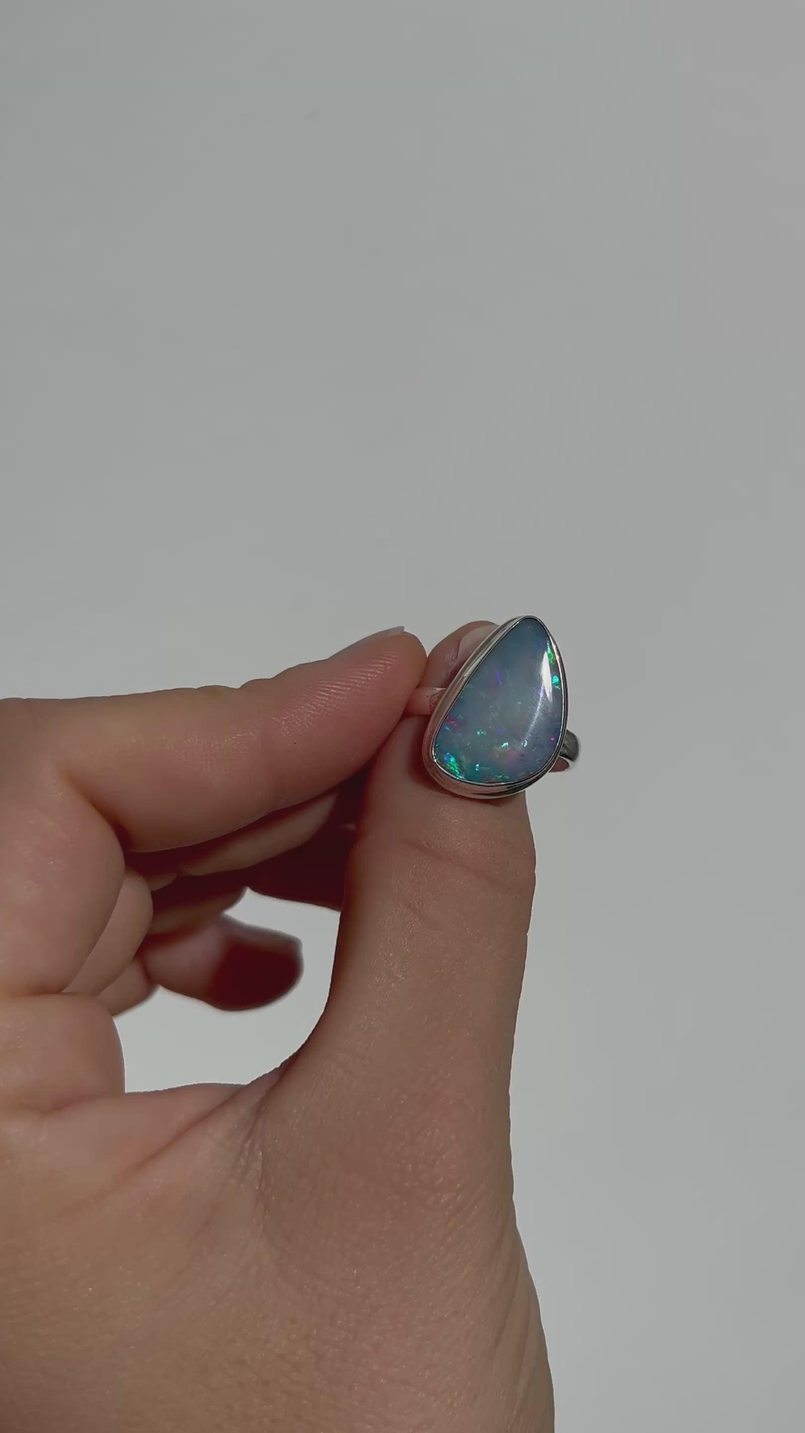 Australian Opal showing soft yet sparkling colors. Eye catching piece of jewellery. The stone is set on a 925 sterling silver double bezel.