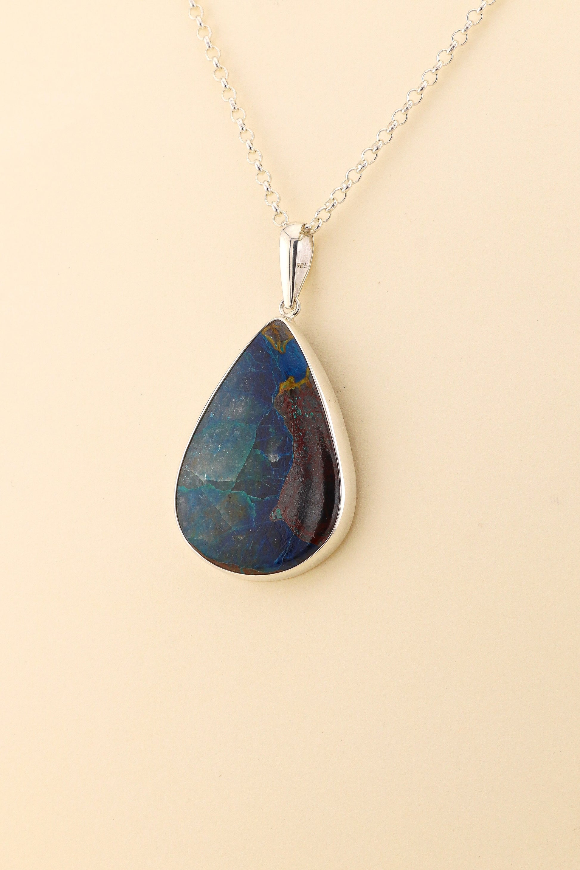 This large Azurite tear drop shows a very interesting pattern for a unique statement piece of jewellery. The stone is set with 925 sterling silver.