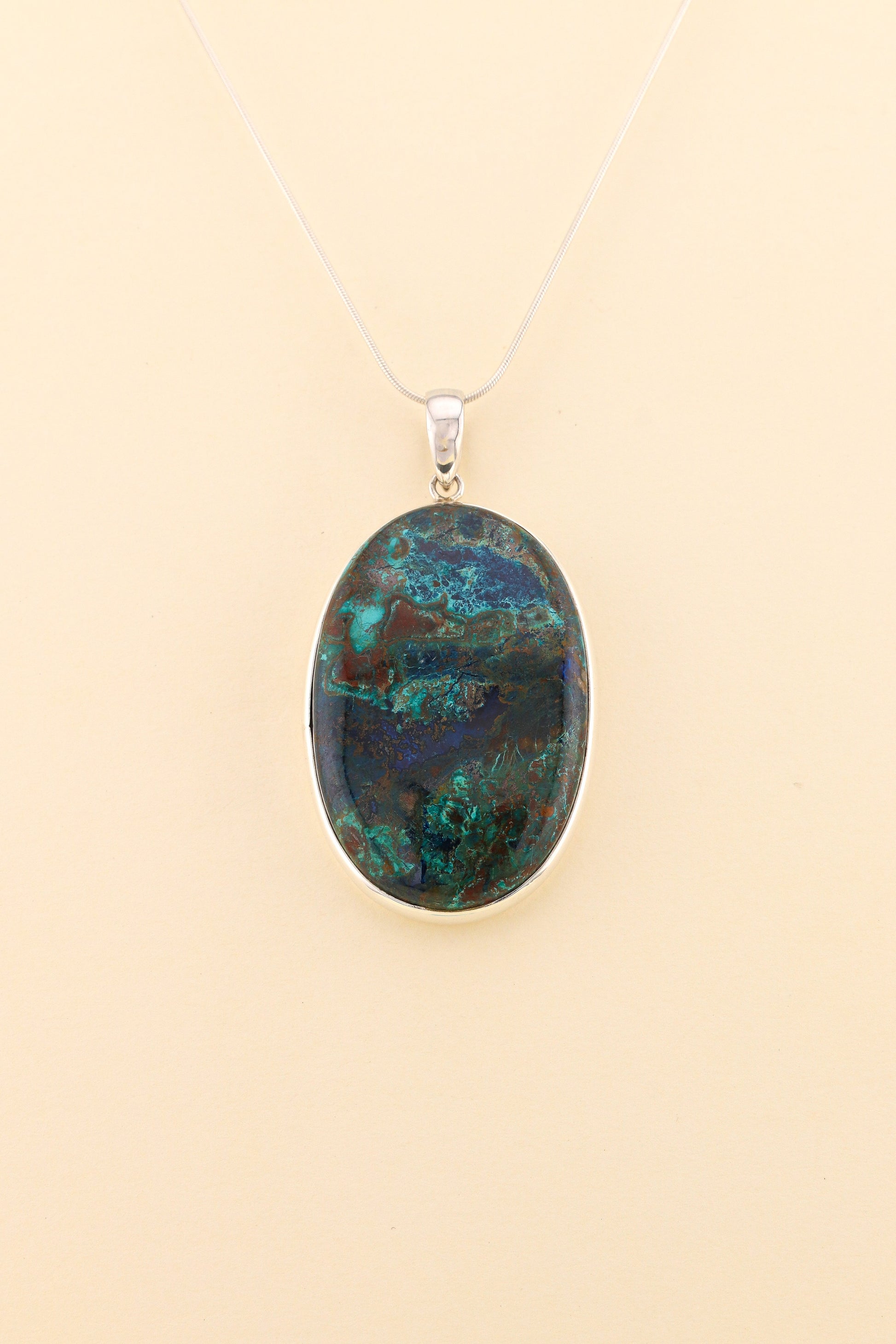 This Azurite stone shows beautiful colors and interesting pattern. The stone is set with 925 sterling silver.