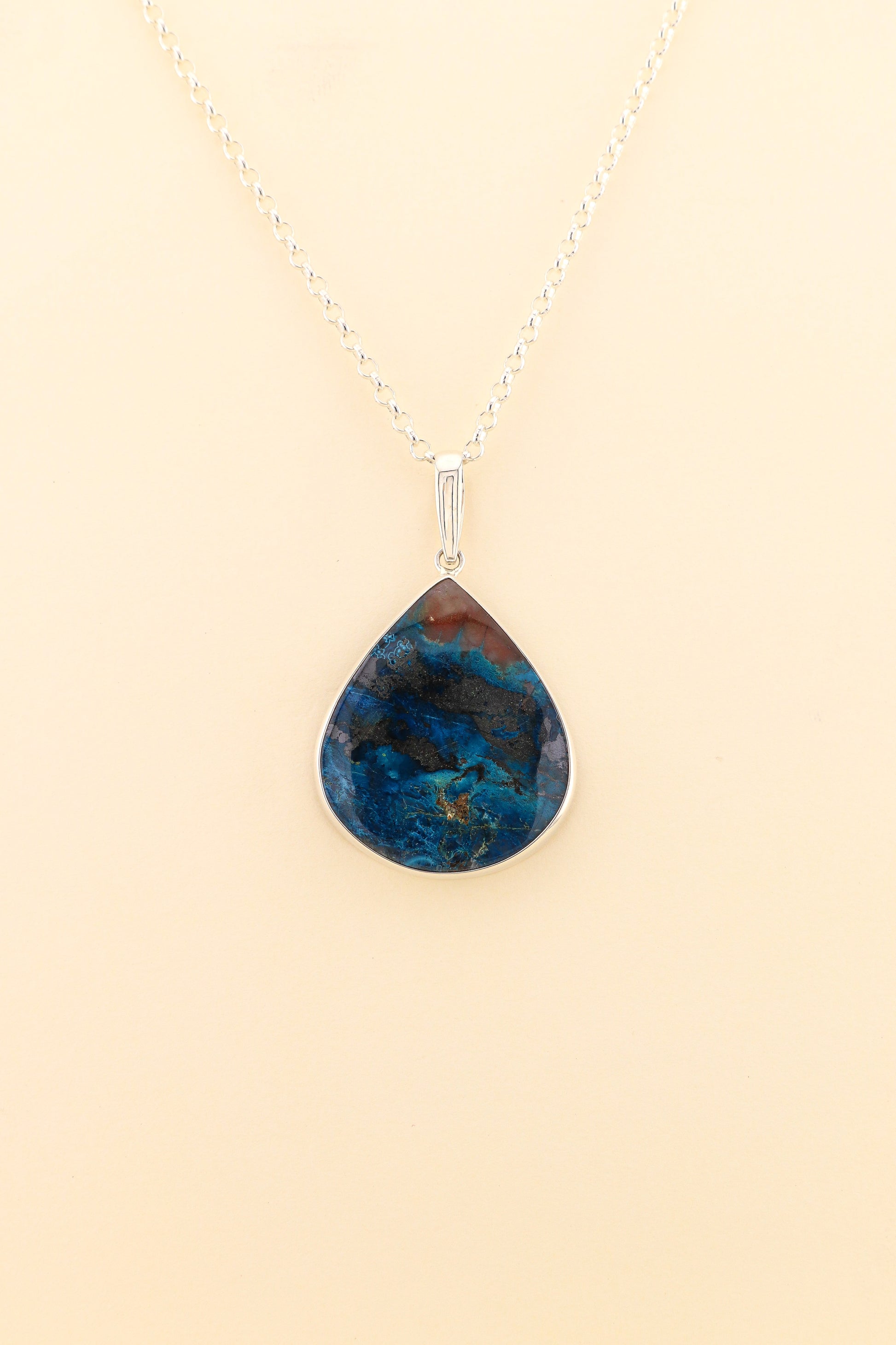 This large tear drop Azurite stone shows beautiful dark blue and copper colors. The stone is set with 925 sterling silver.