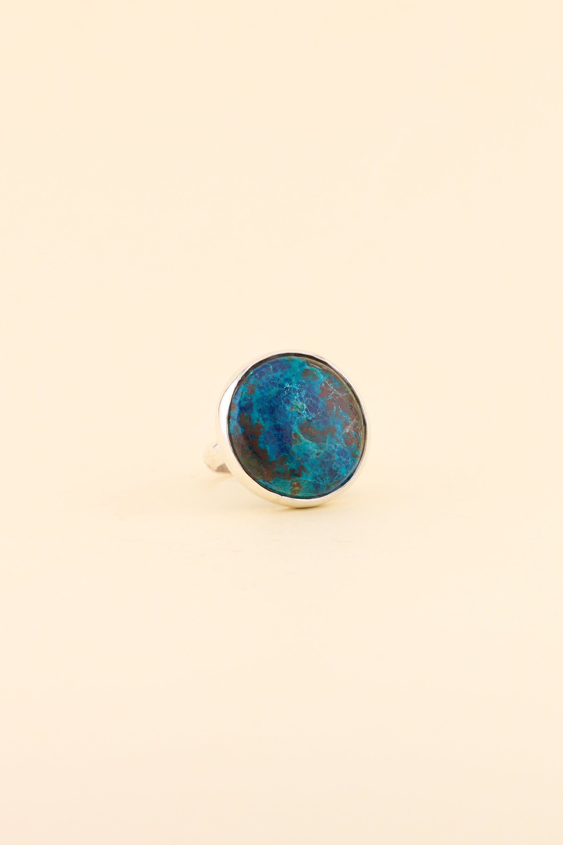 This Azurite stone shows a beautiful pattern that reminds us of an aerial view of the sea. The stone is set with 925 sterling silver.