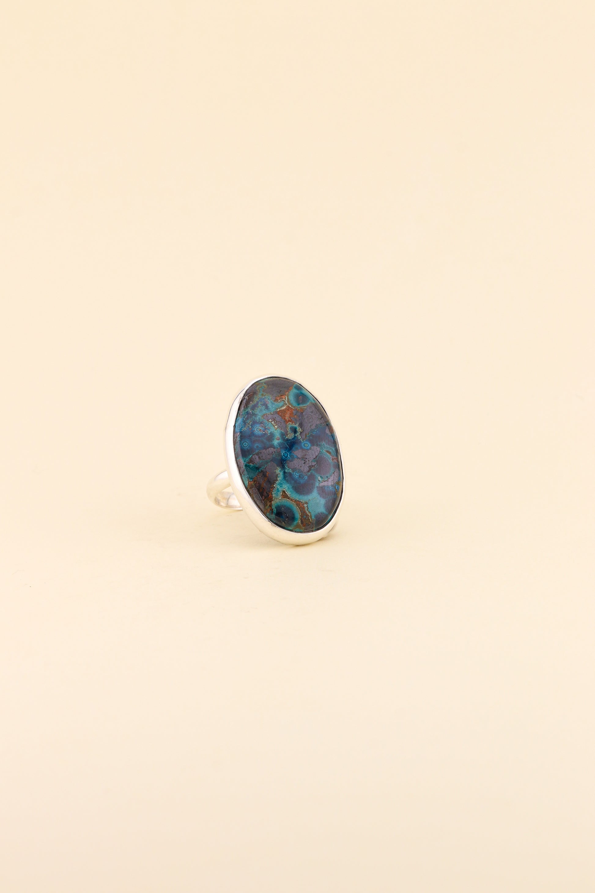 This Azurite stone shows a beautiful pattern that reminds us of an aerial view of the sea. The stone is set with 925 sterling silver.