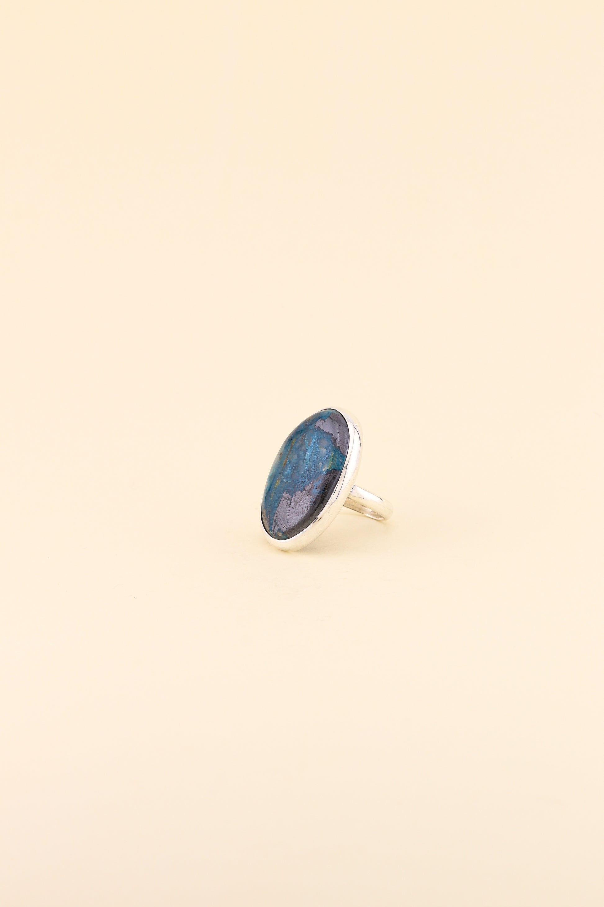 This Azurite stone has an interesting dark blue and copper pattern. The stone is set with 925 sterling silver.