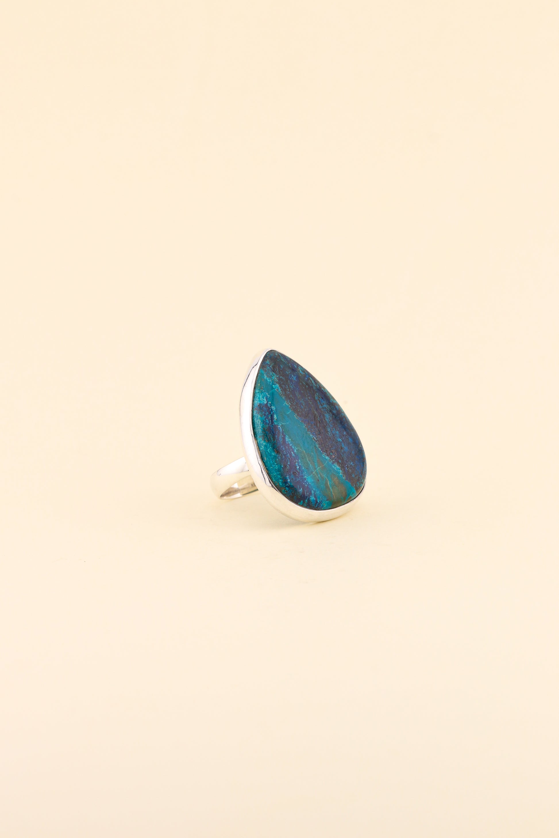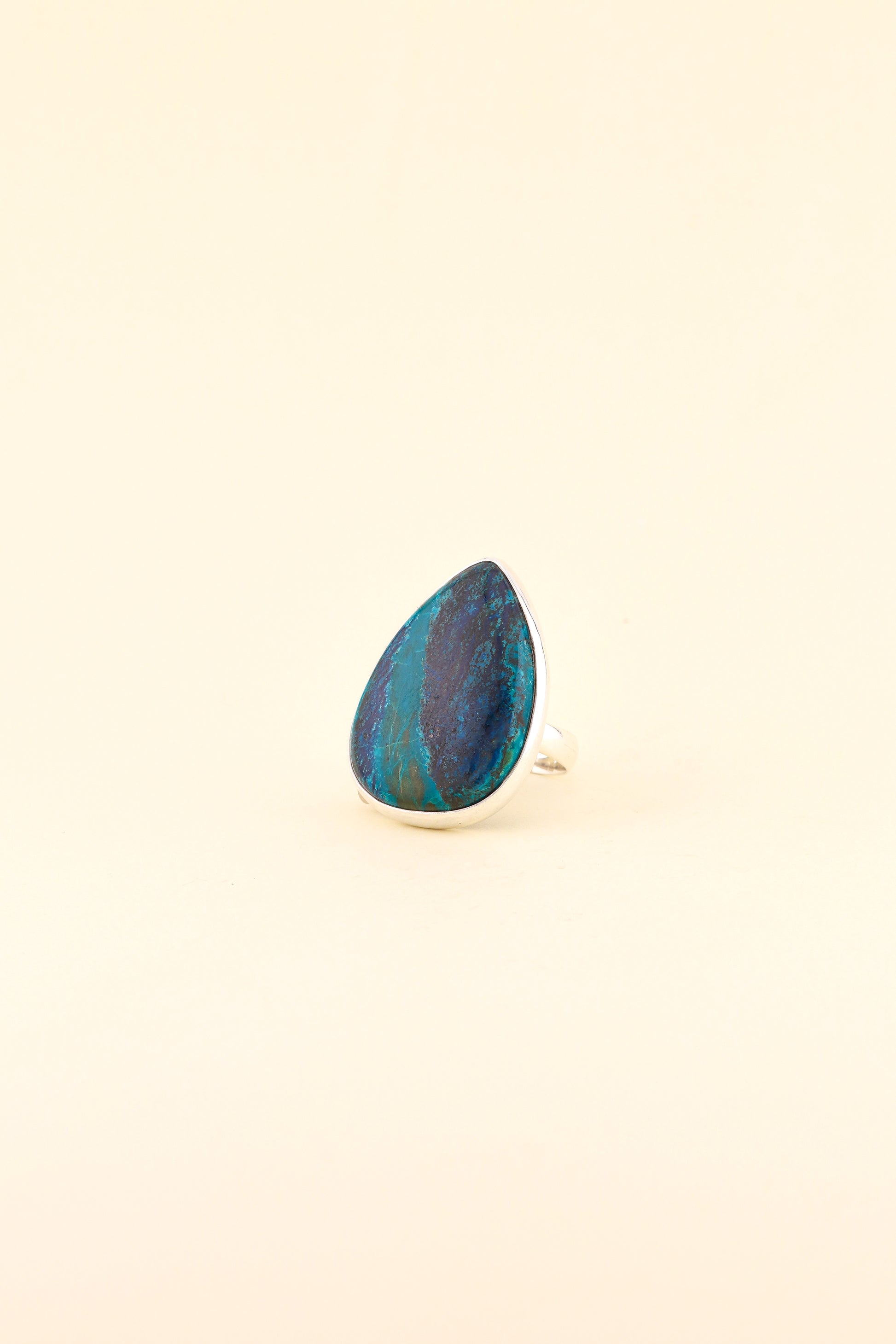 This large tear drop Azurite stone shows a beautiful pattern that reminds us of an aerial view of a water way. The stone is set with 925 sterling silver.