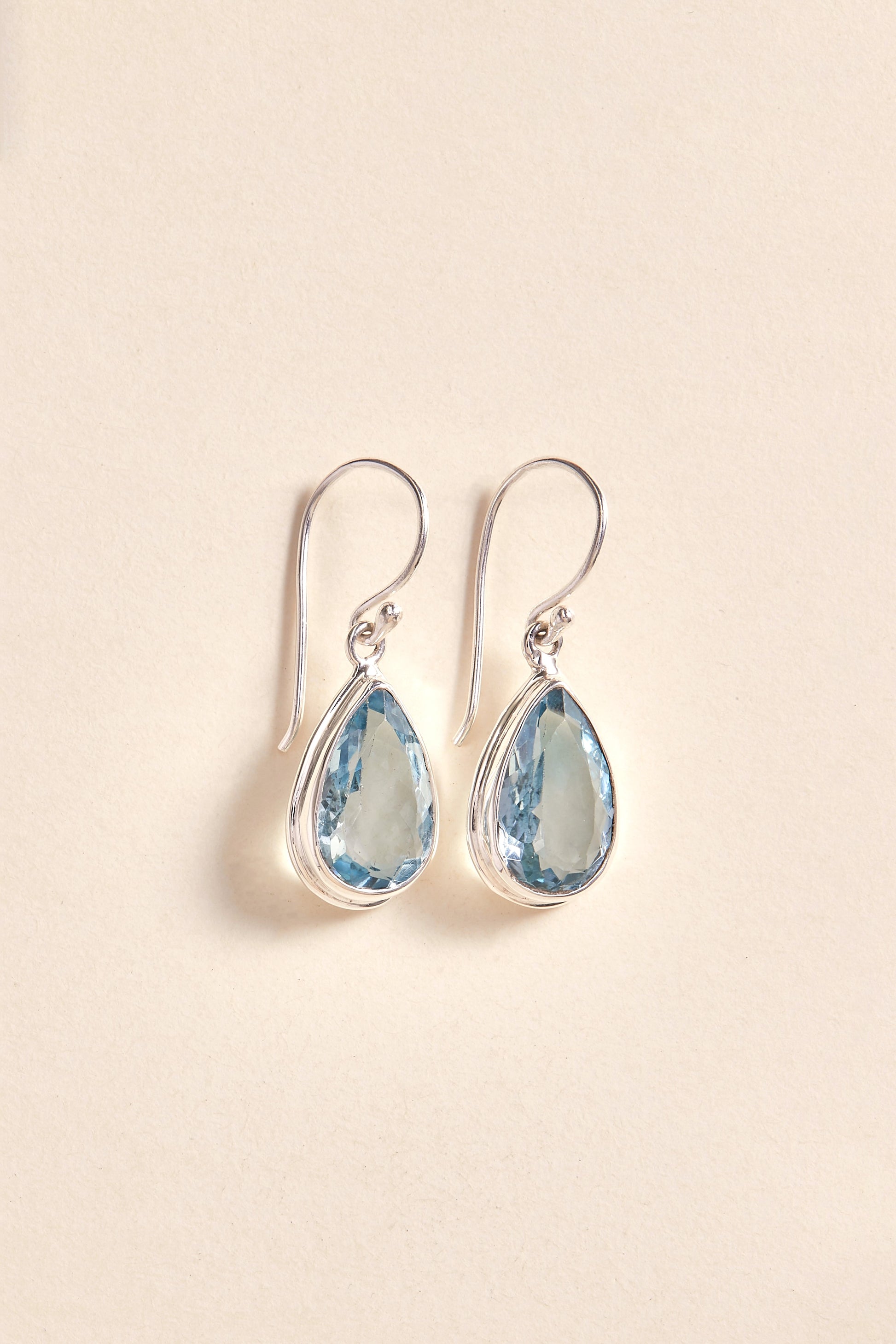 These large tear drop Blue Topaz stones make an elegant pair of earrings to wear for any occasion. The stones are set on a 925 sterling silver double bezel.