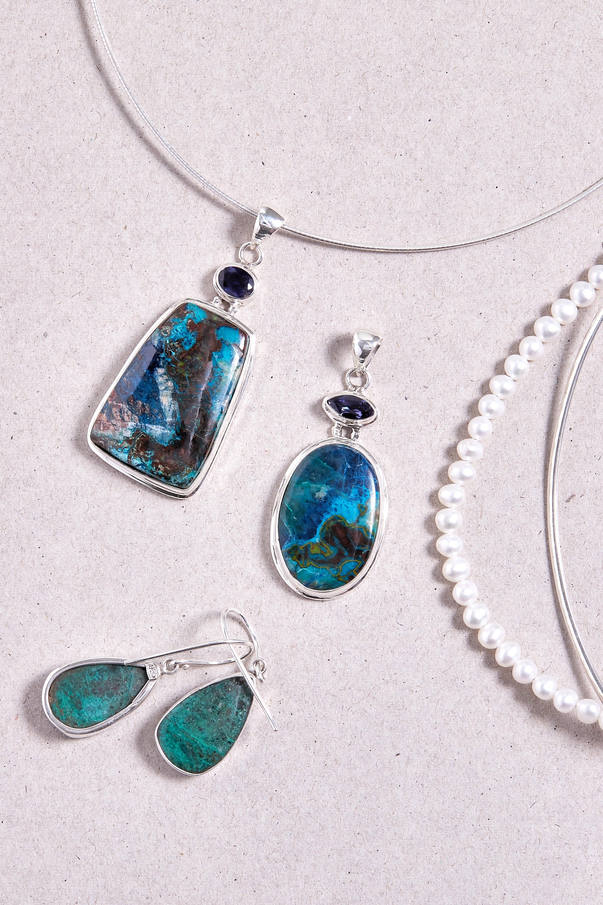 Theses beautiful Chrysocolla stones make a lovely pair of earrings to add to your collection. The stones are nicely set with 925 sterling silver.
