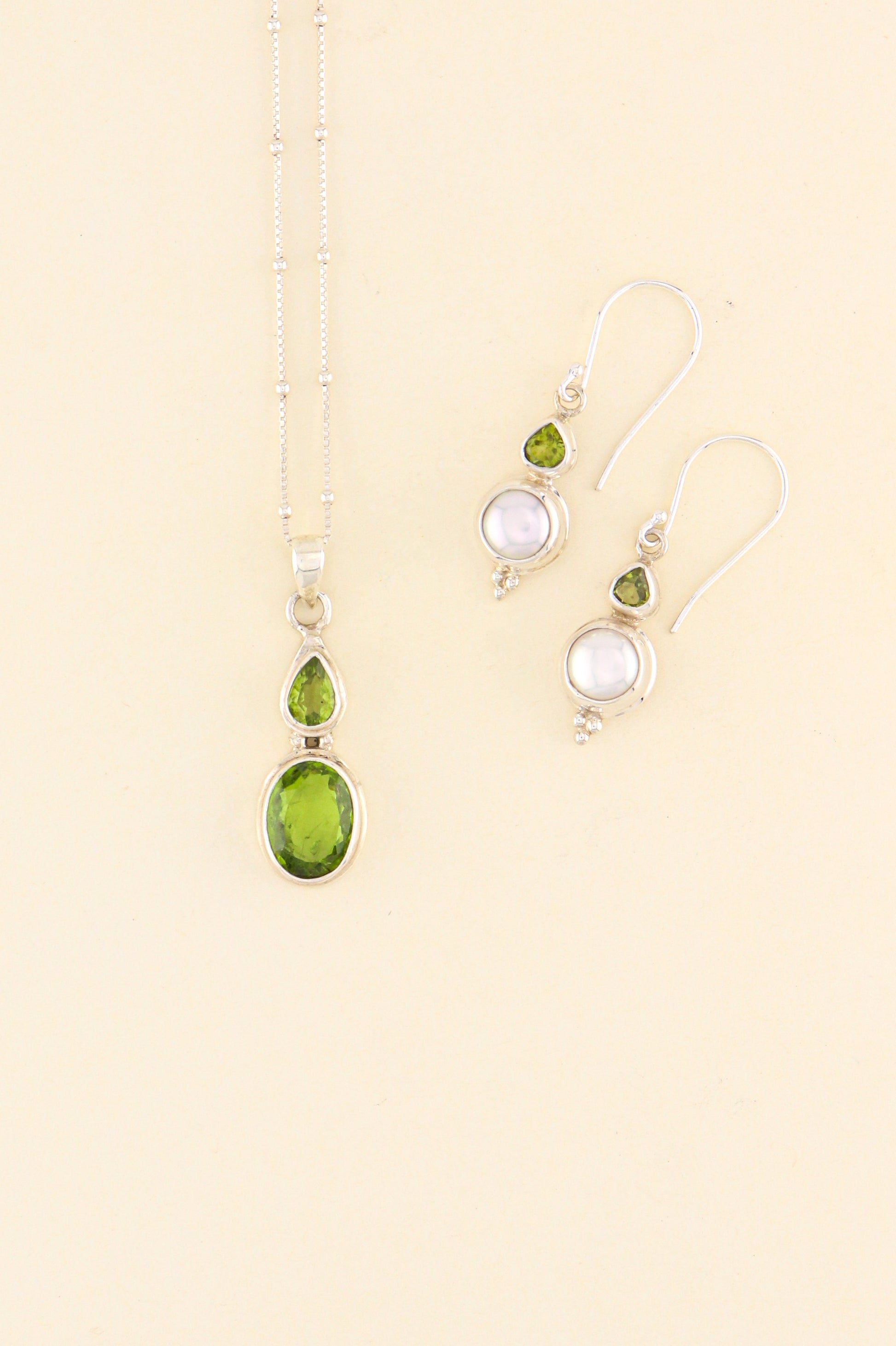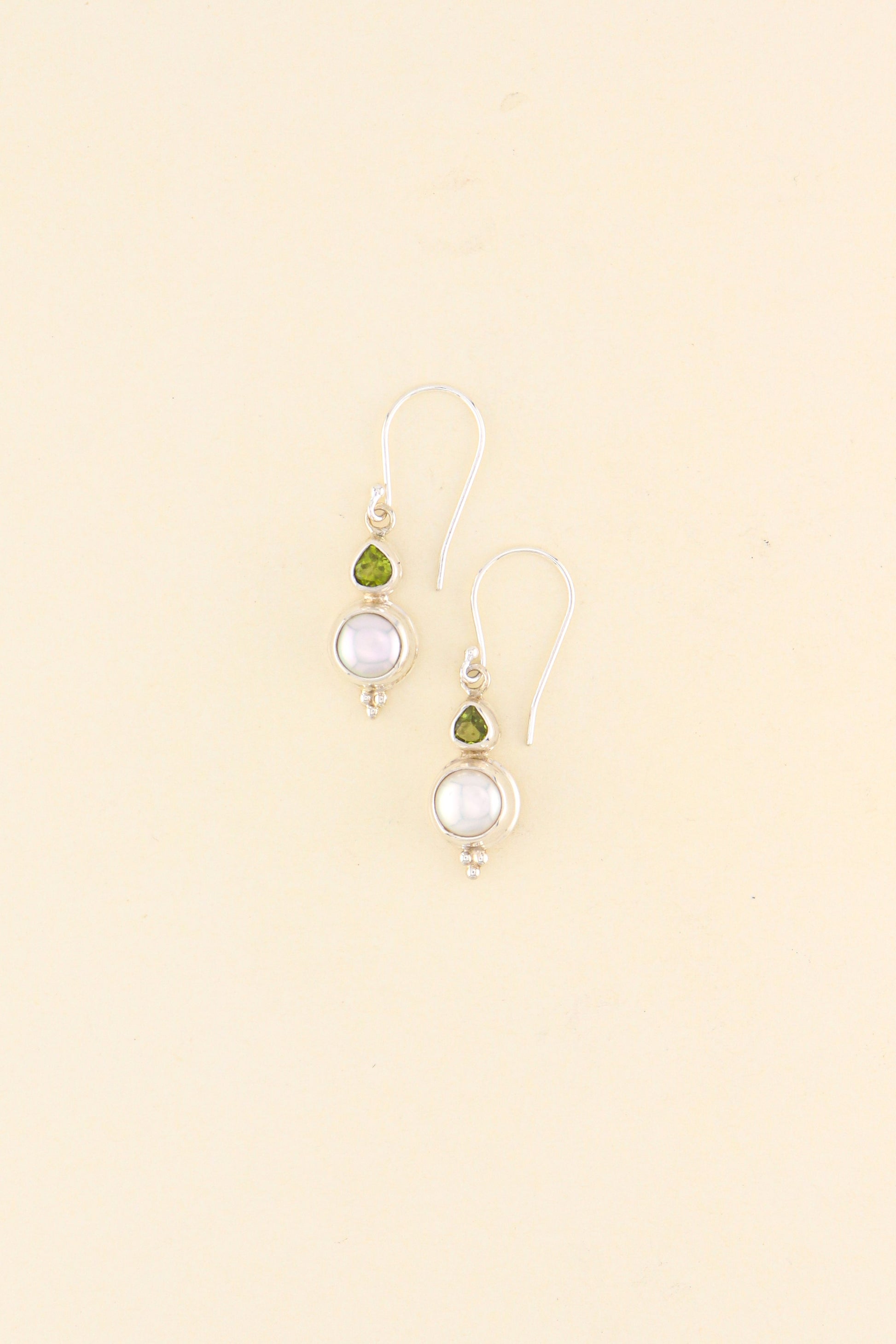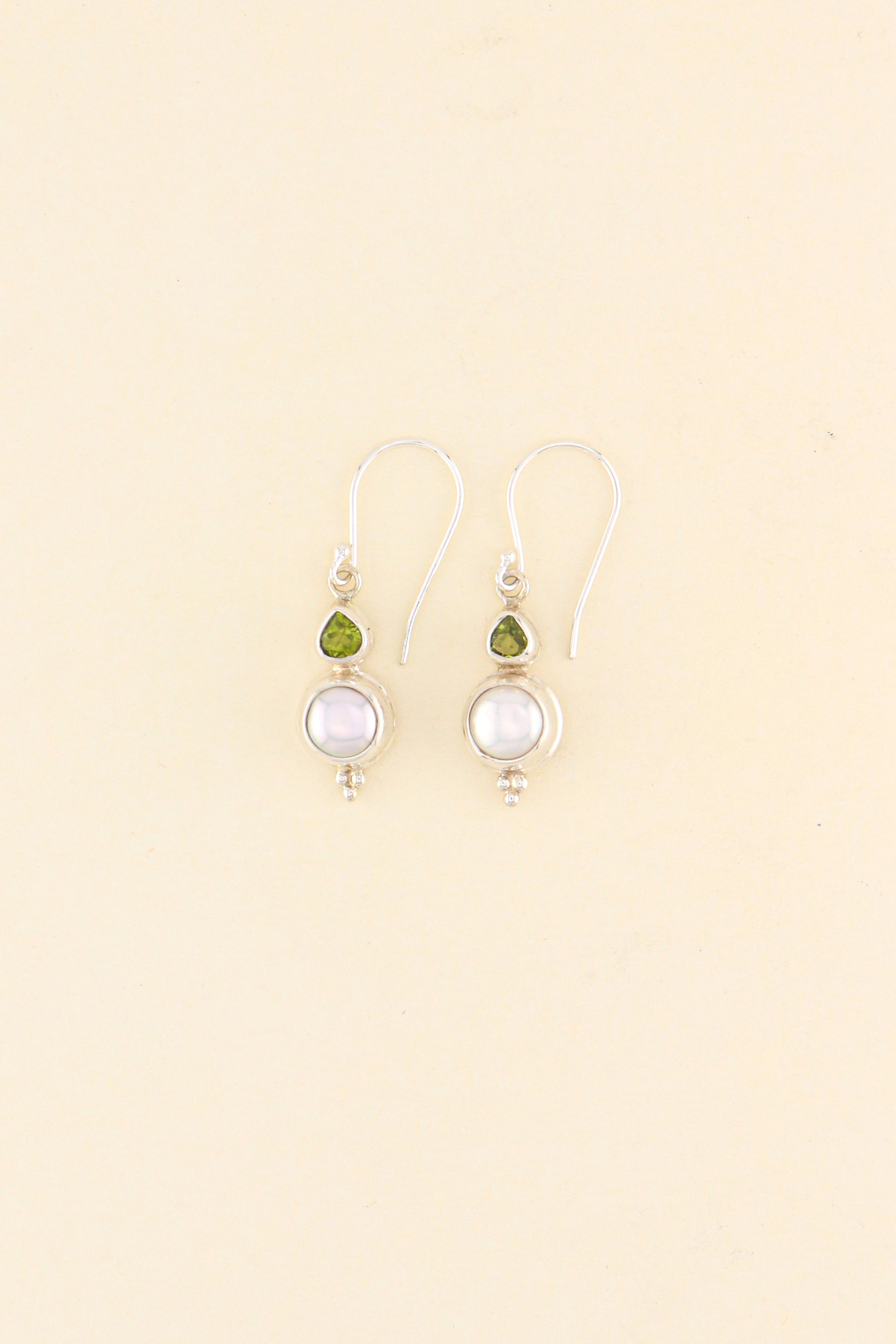 Our Freshwater Pearl and Peridot earrings design is a must have in your jewellery collection. The stones are set on a 925 sterling silver double bezel.