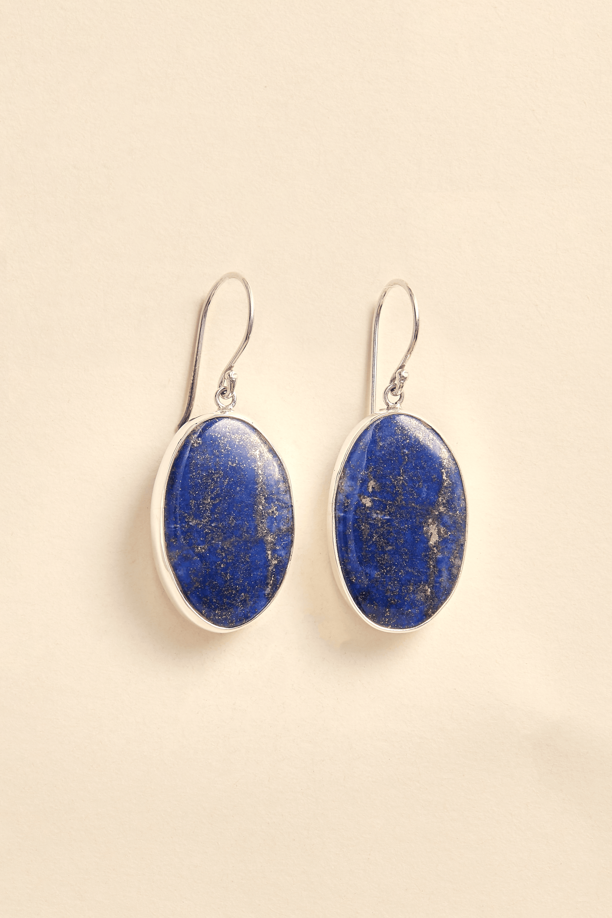 Theses large, beautiful dark Lapis Lazuli with Pyrite speckles stones make a statement pair of earrings. The stones are set using 925 sterling silver.