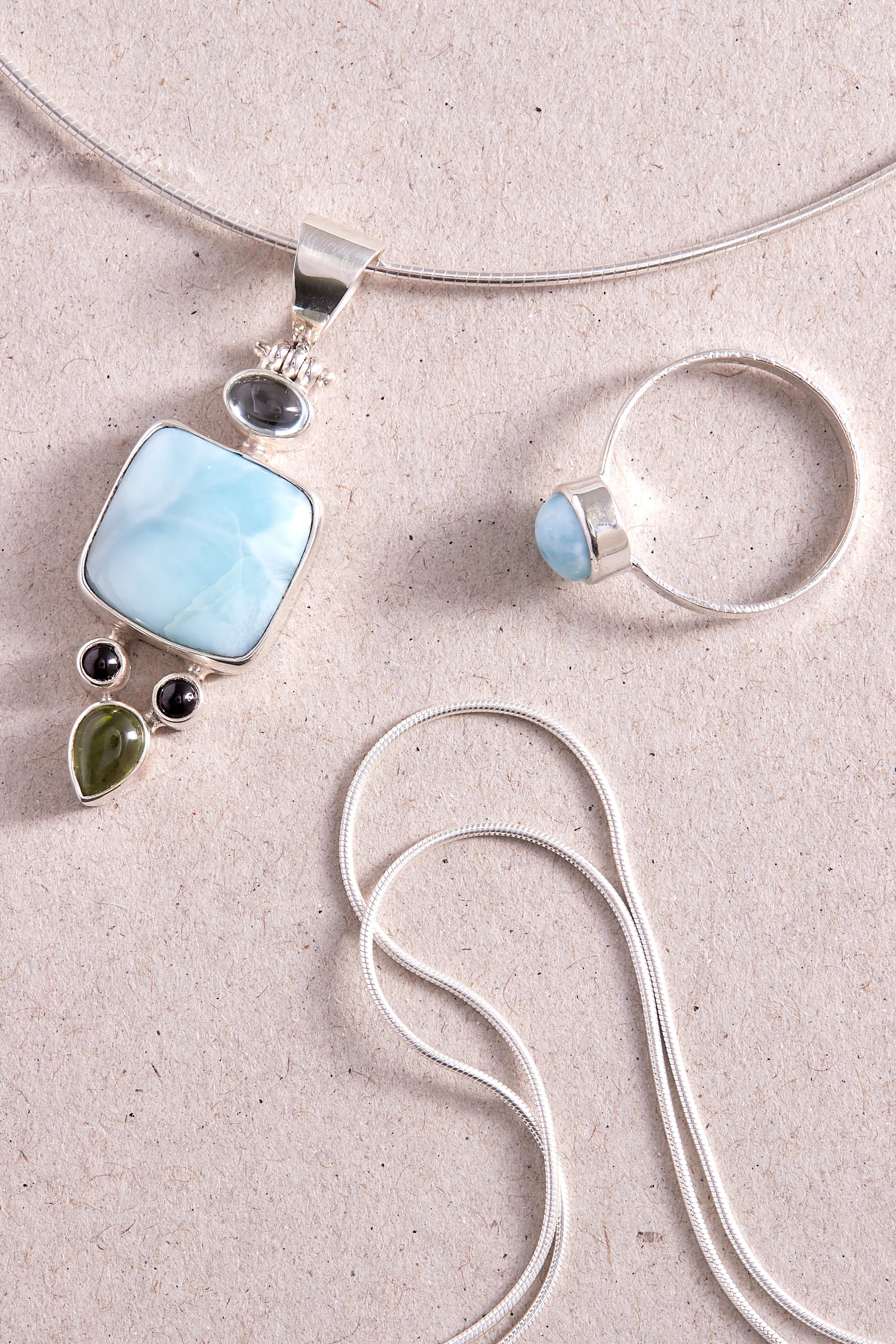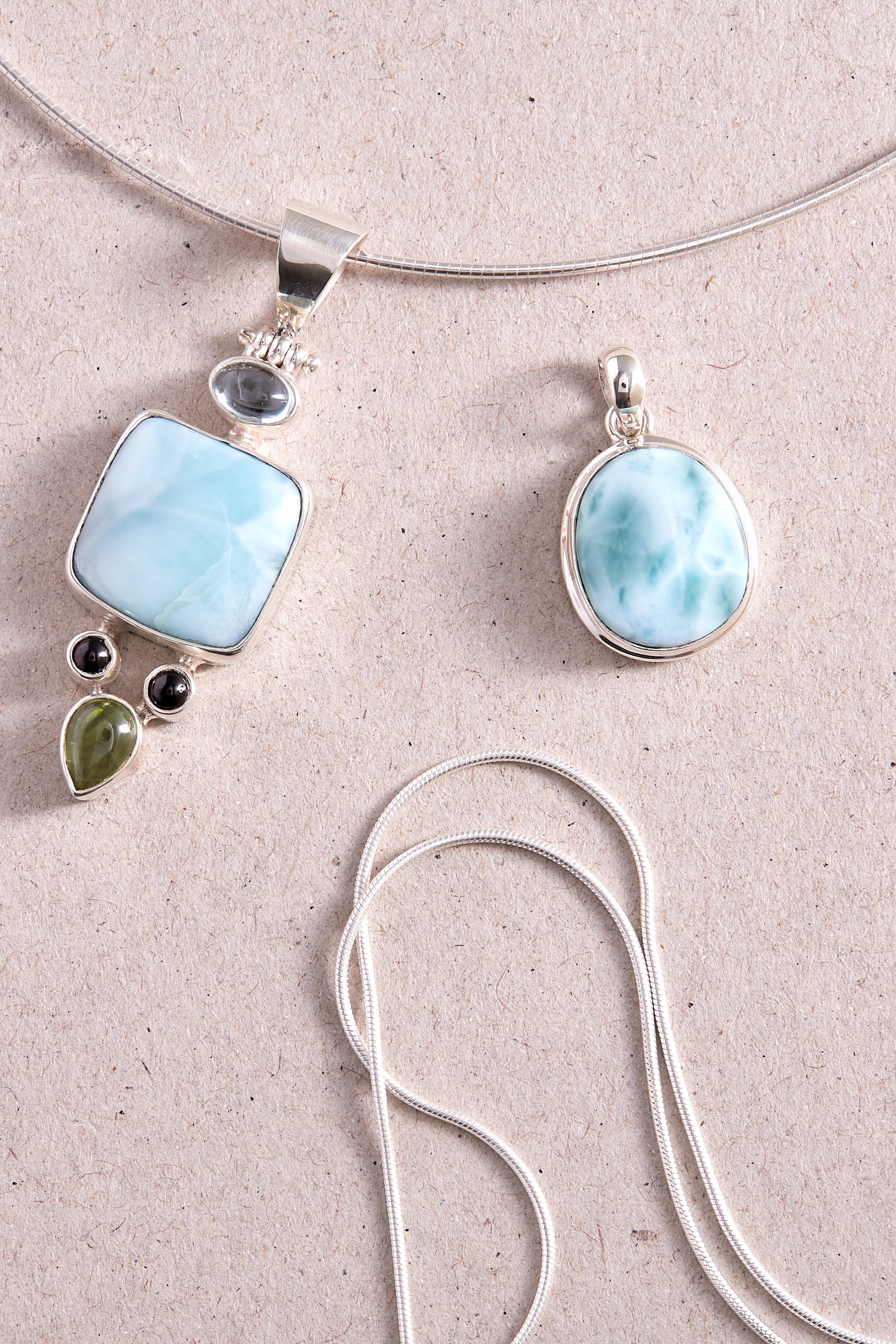 Larimar is the ultimate summer jewellery! That pendant is the perfect go-to pendant to wear all summer. The stones are set with 925 sterling silver.