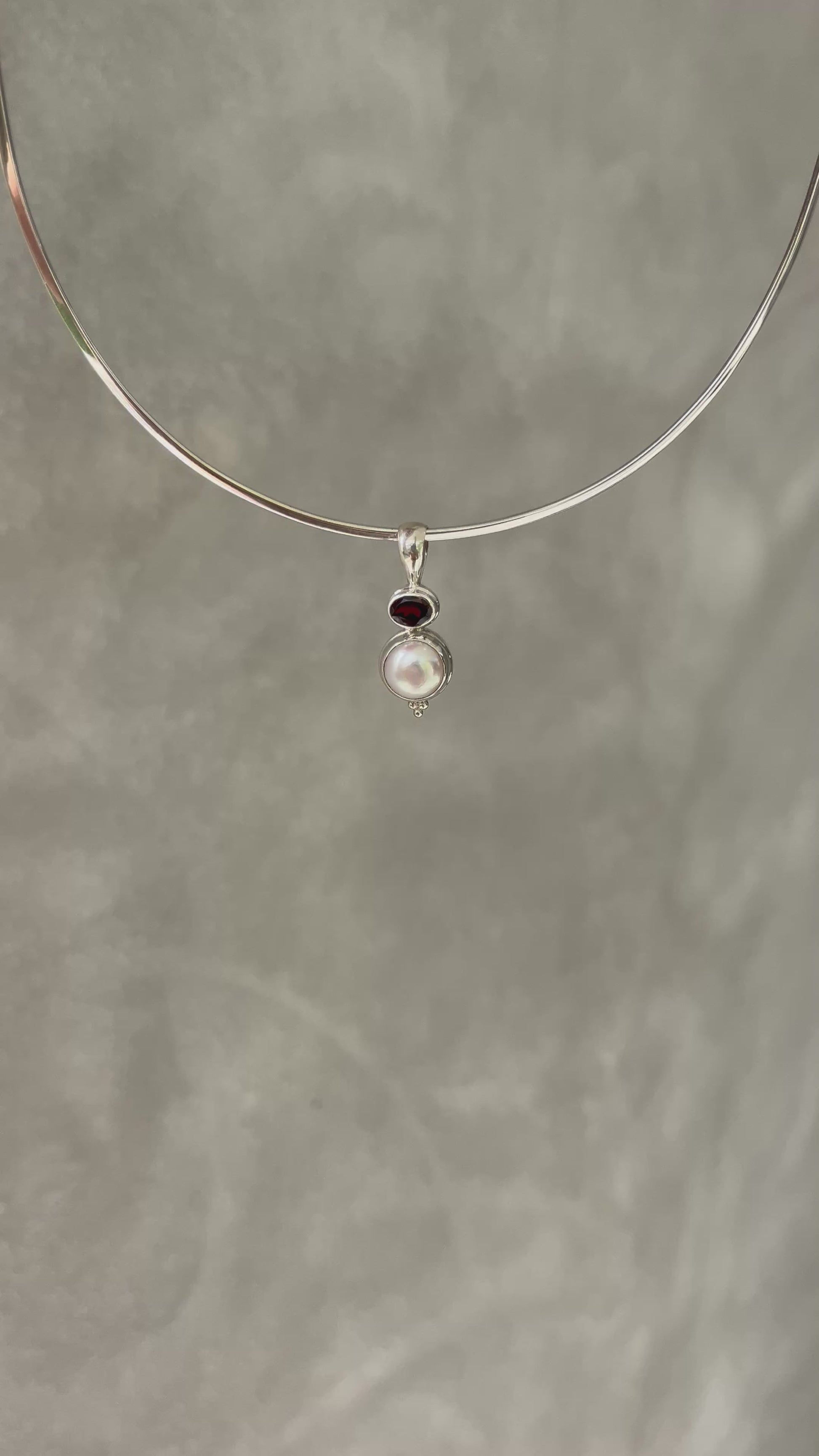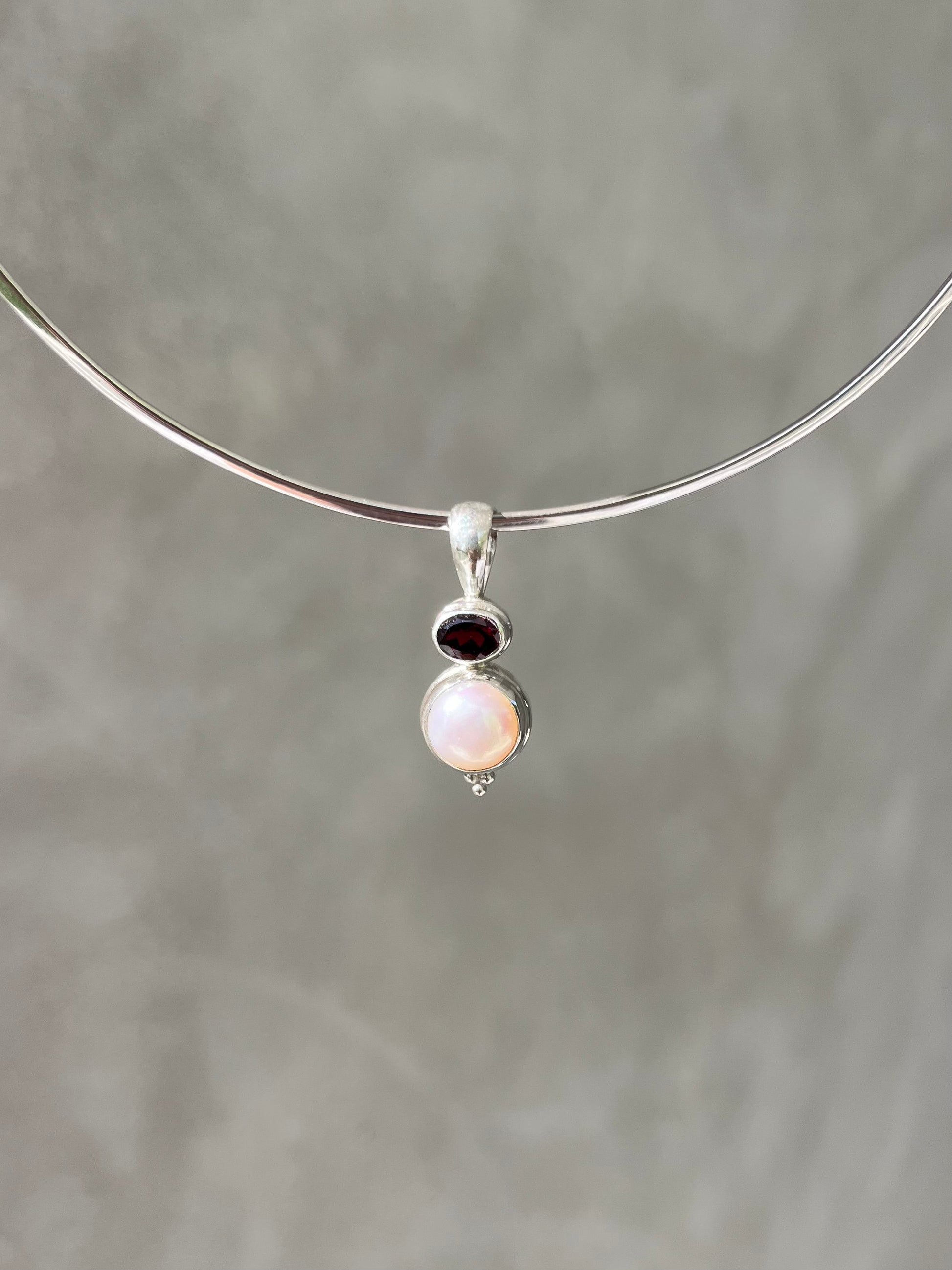 The combination of Garnet and Freshwater Pearl makes a lovely pendant. The stones are set on a 925 sterling silver double bezel.