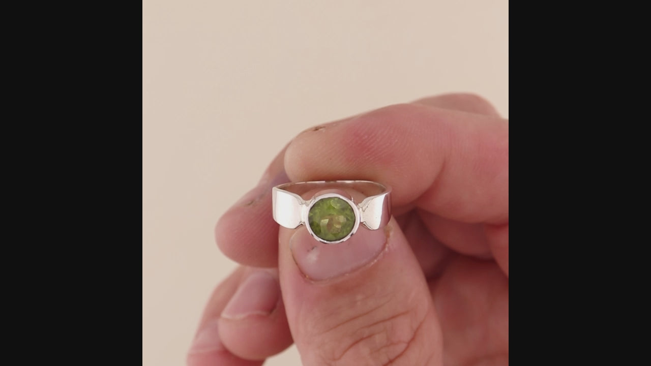 Our wide band ring design in round Peridot makes a lovely ring to wear everyday. The ring is made using 925 sterling silver.