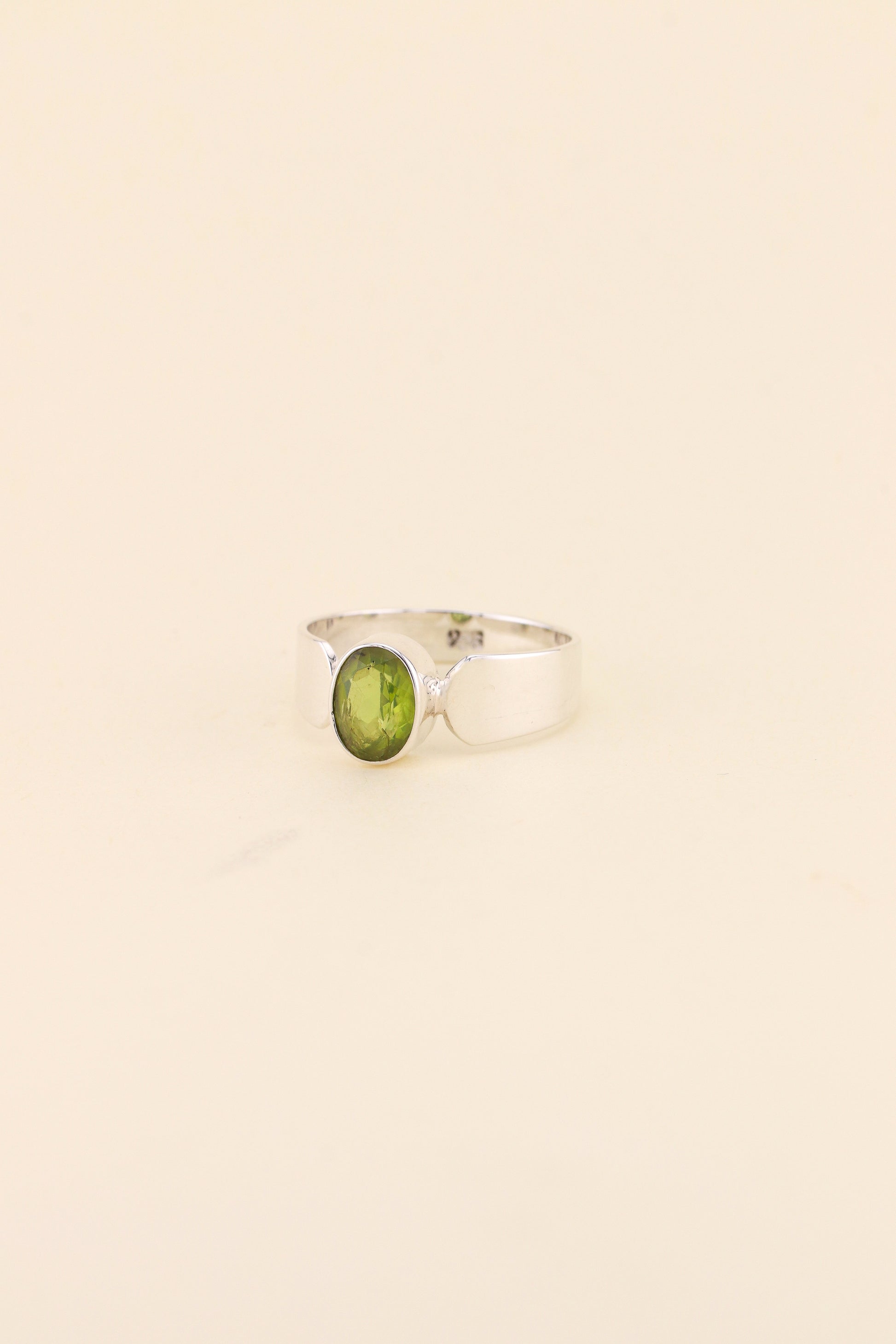 Our wide band ring design in oval Peridot is a lovely ring to wear everyday. The ring is made using 925 sterling silver.