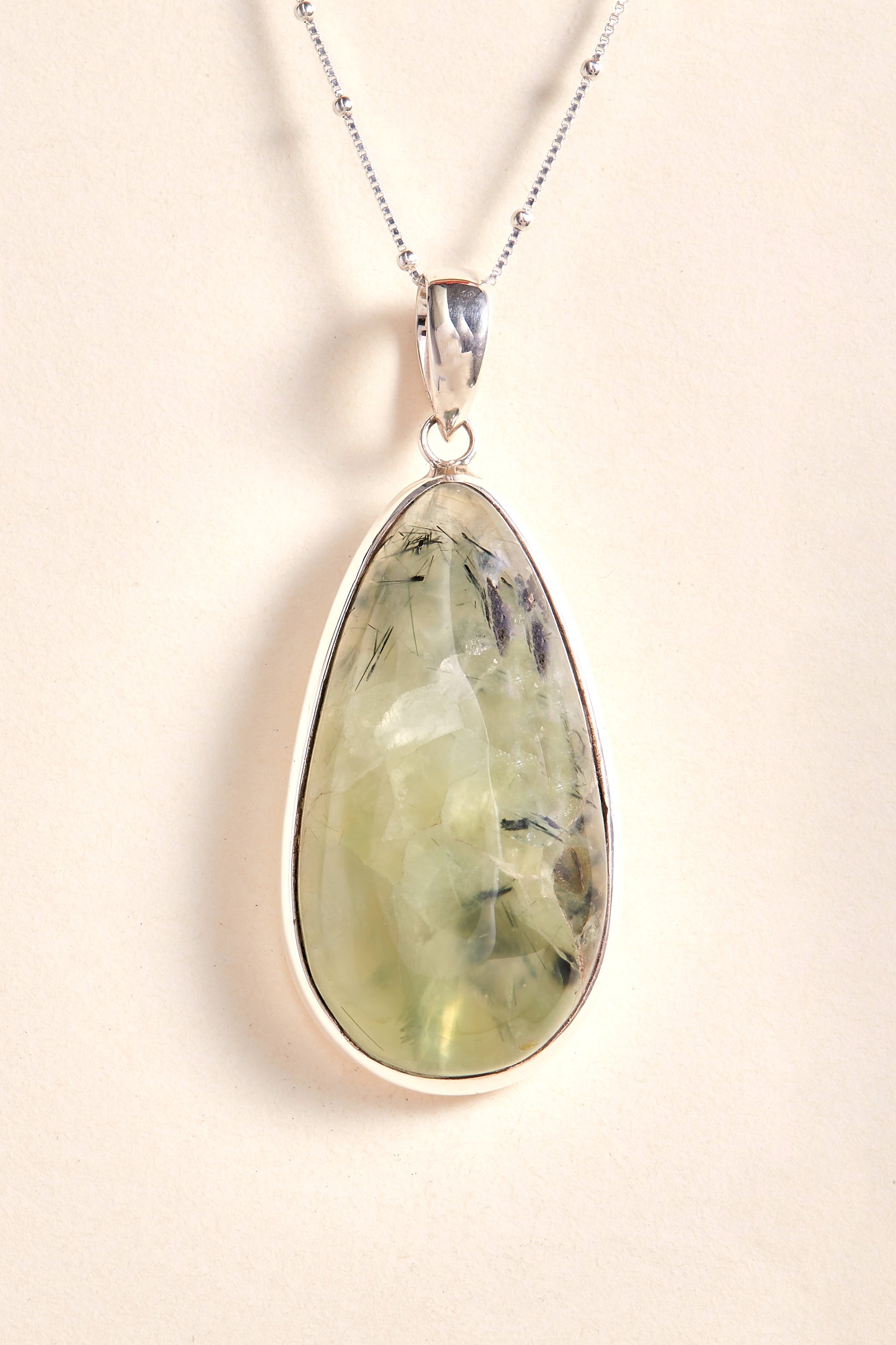 Each Prehnite stone is always very unique thanks to the Epidote inclusions they often have. That stone makes the pendant a true 'one-of-a-kind' piece of jewellery. The pendant is made with 925 sterling silver.