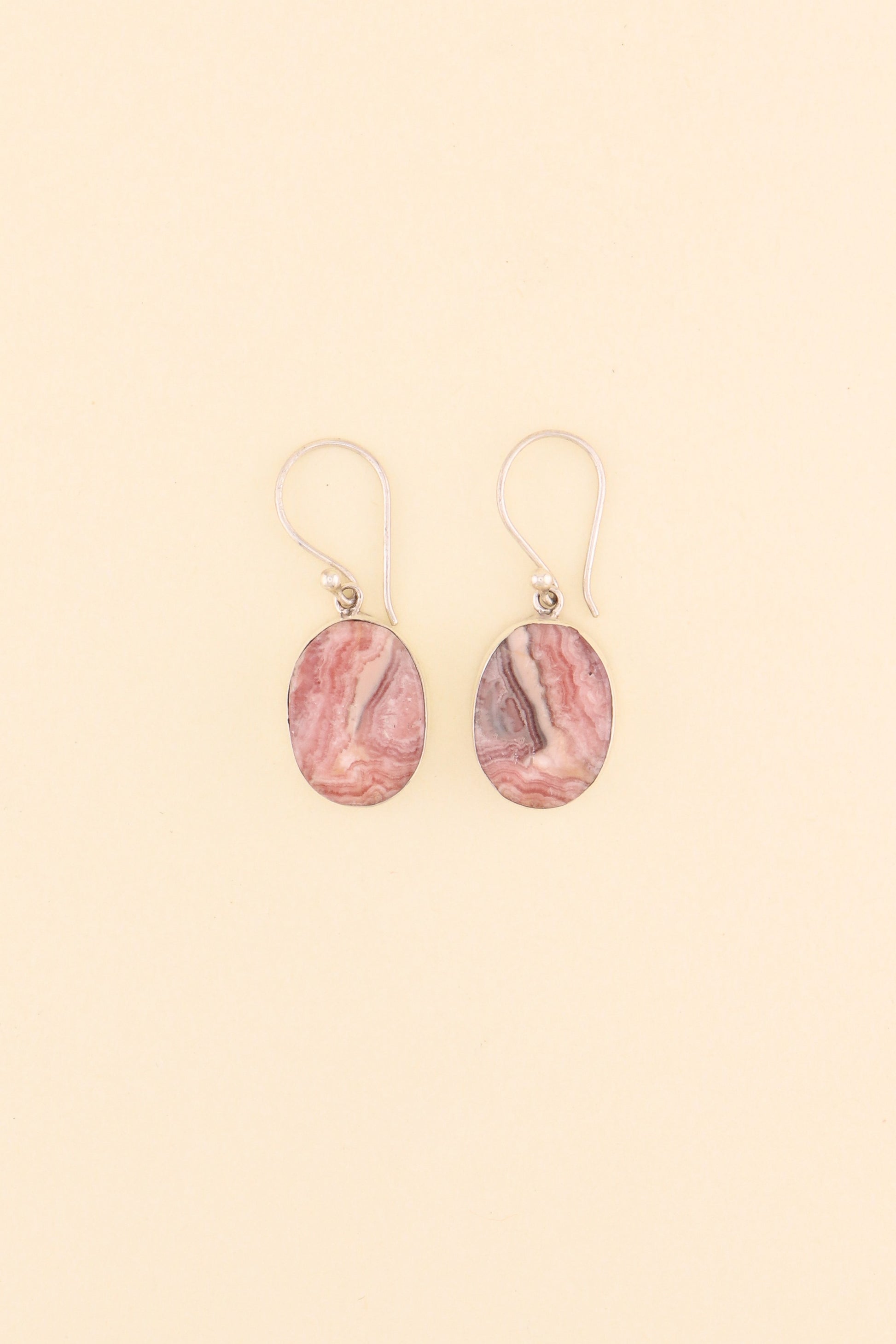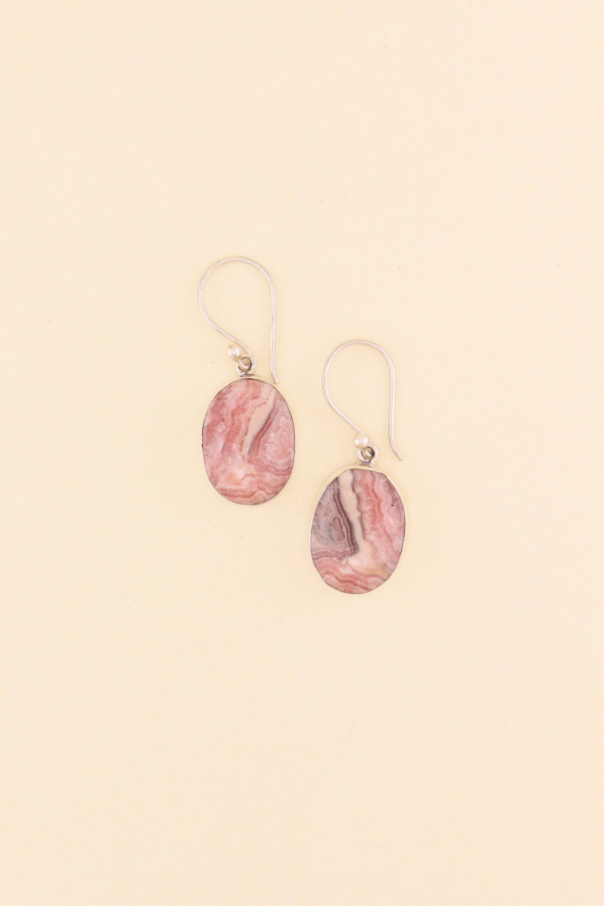 The pale pink Rhodochrosite stones showing lovely pattern make a beautiful pair of earrings. The stones are set with 925 sterling silver.