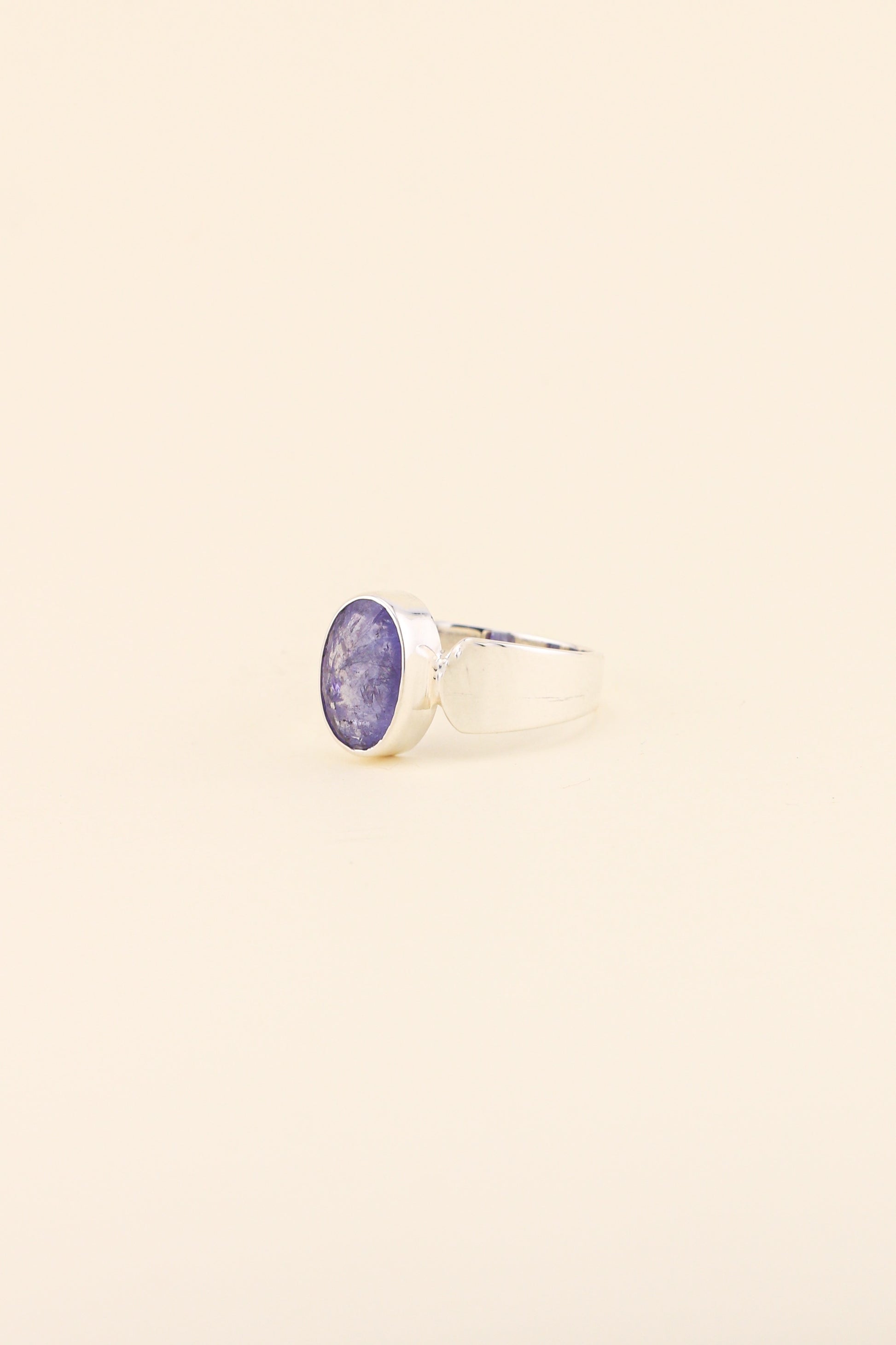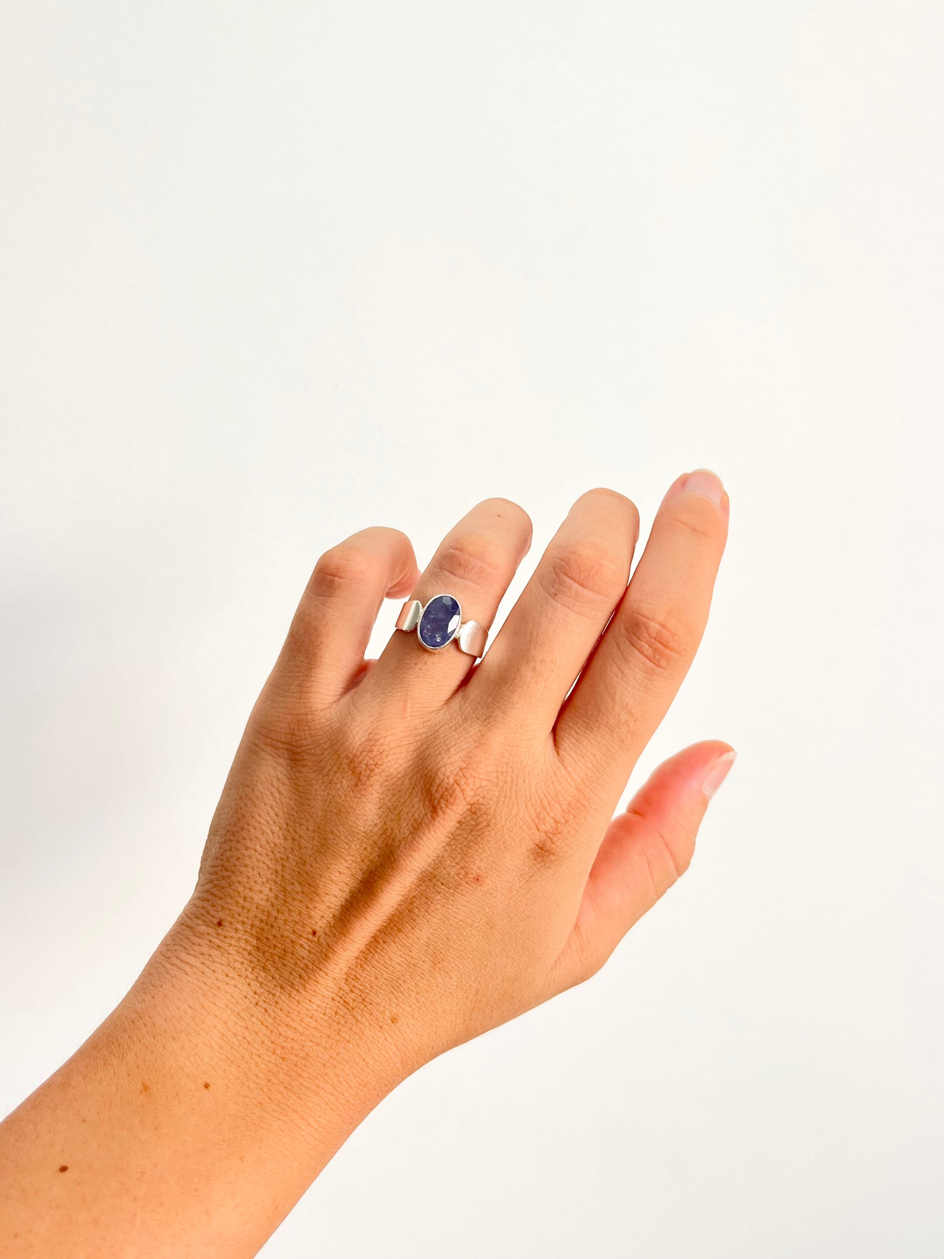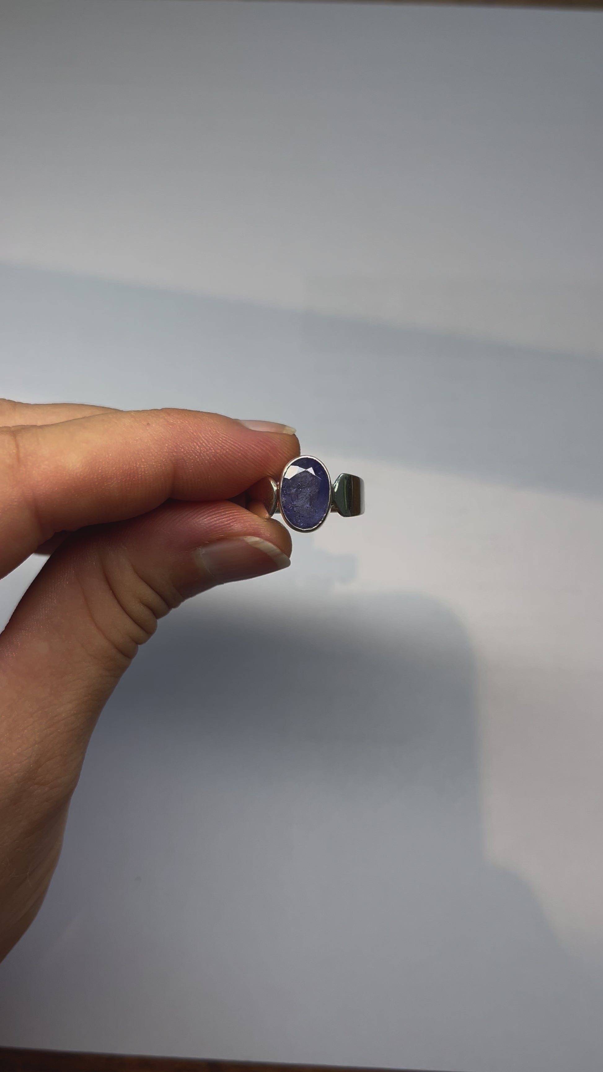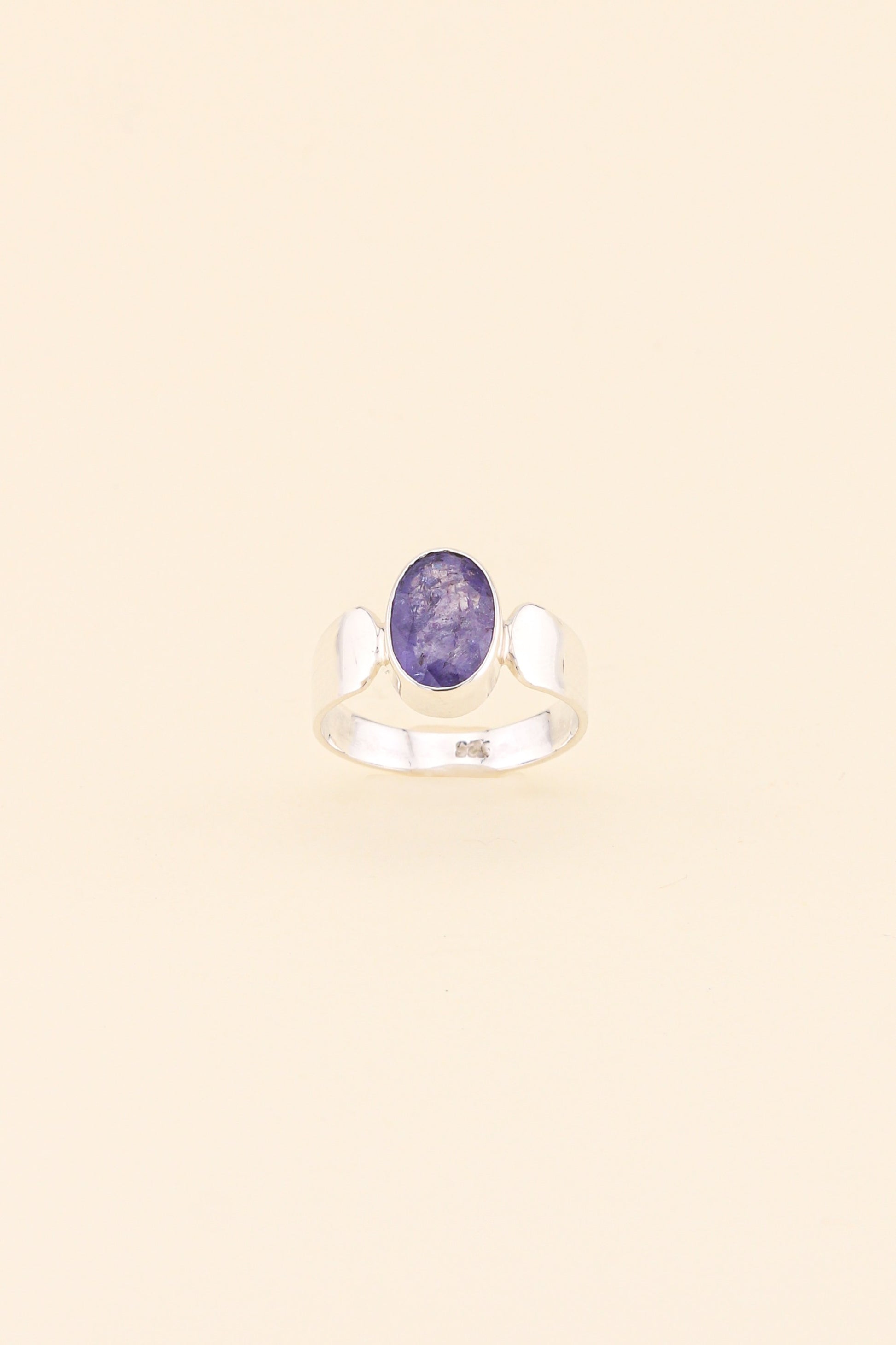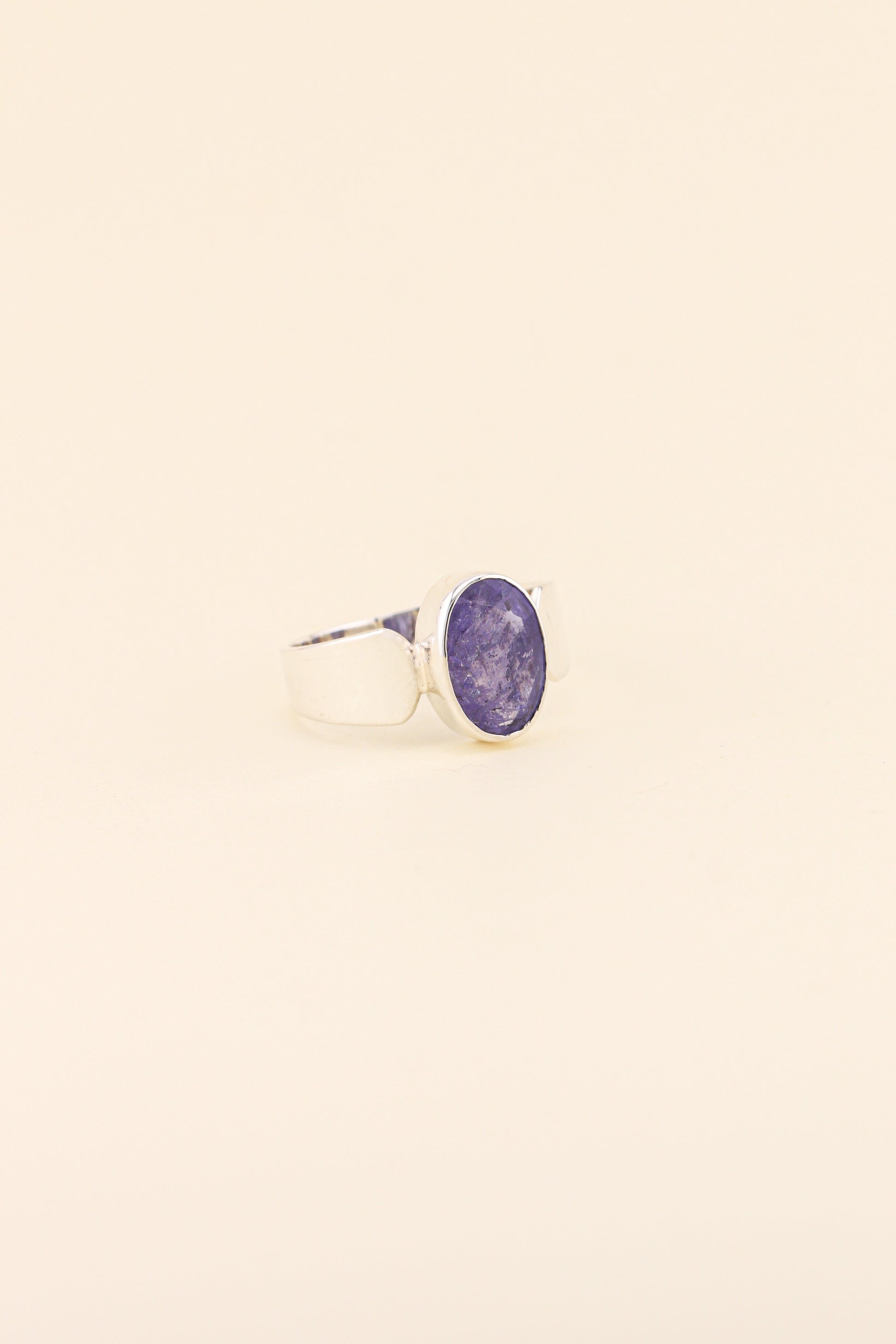 Our original wide band ring design with a beautiful faceted Tanzanite. The stone is set on a 925 sterling silver bezel.