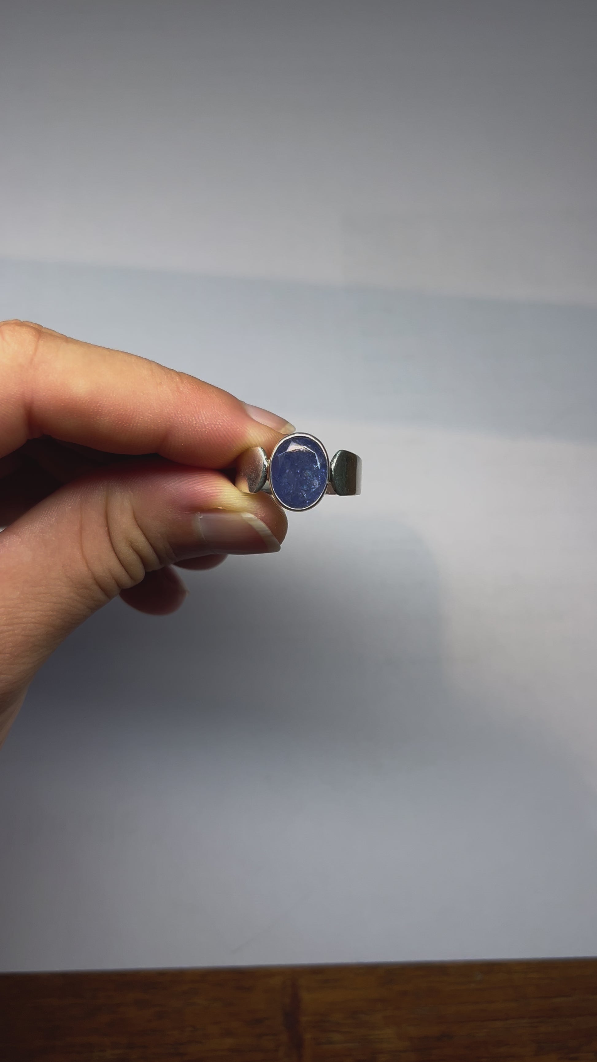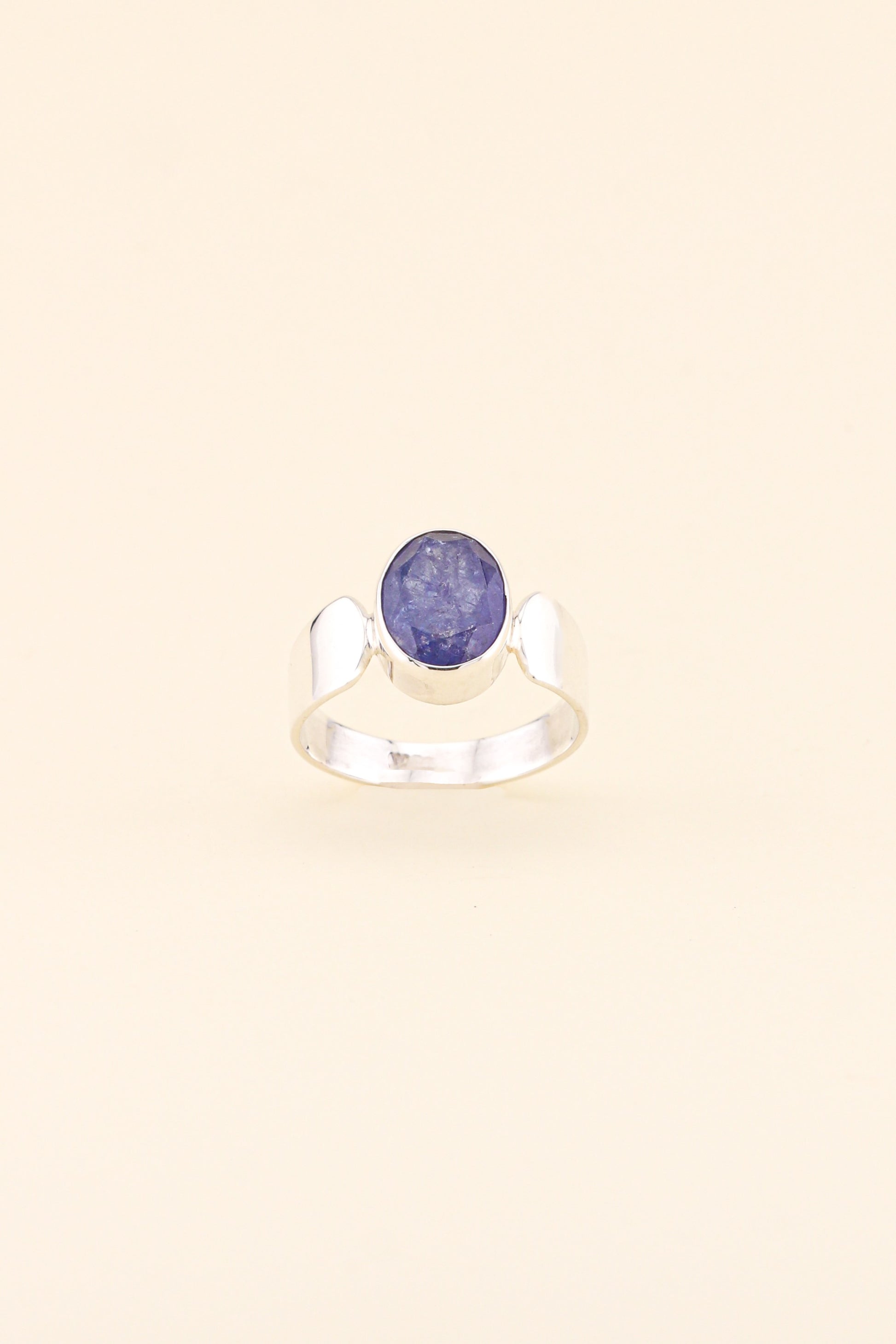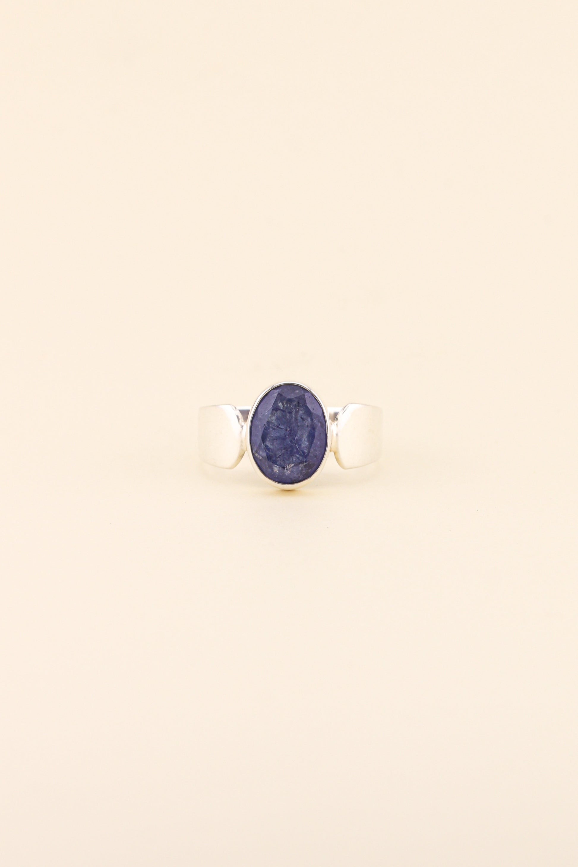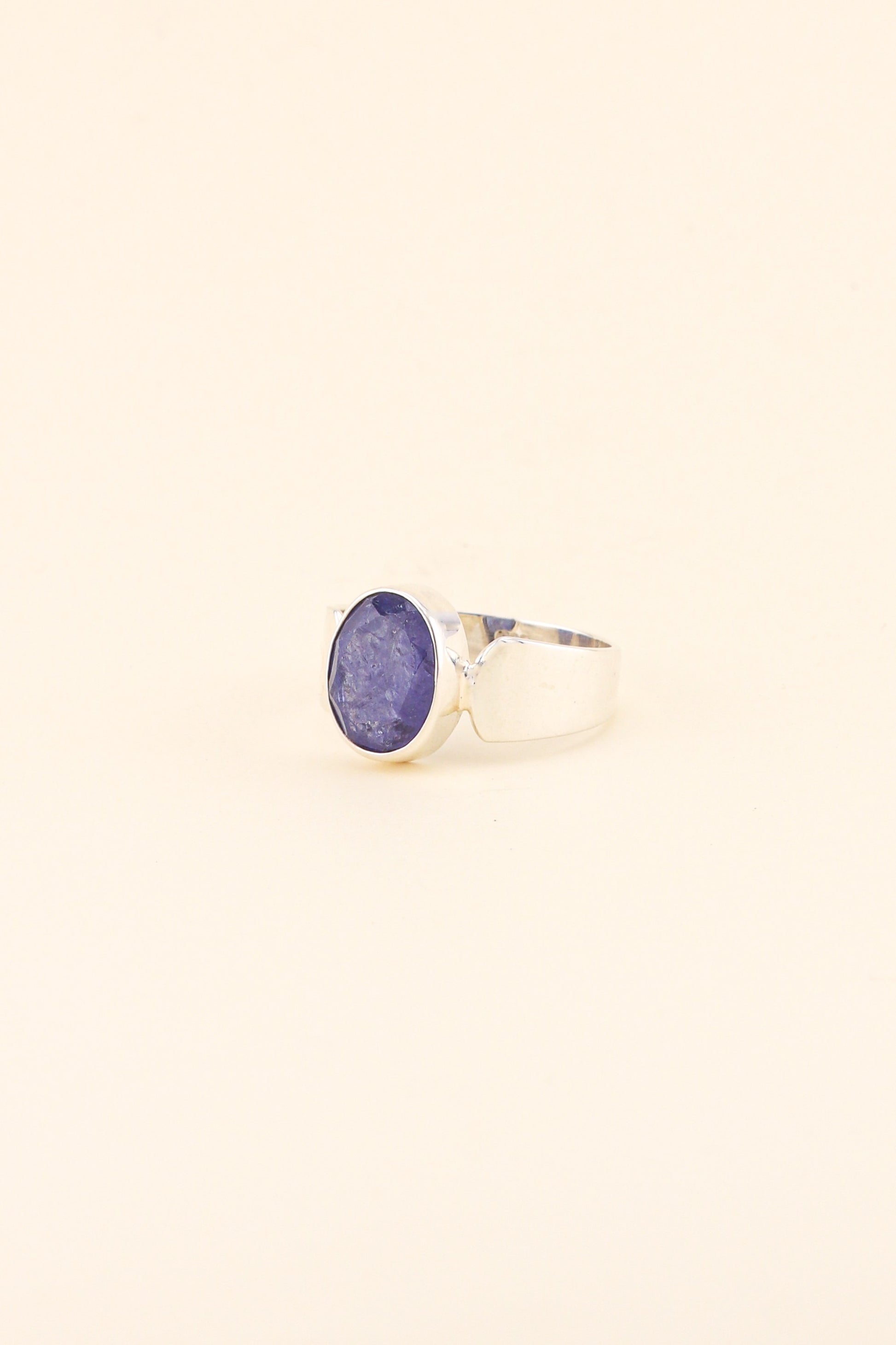 Our original wide band ring design with a beautiful faceted Tanzanite. The stone is set on a 925 sterling silver bezel.