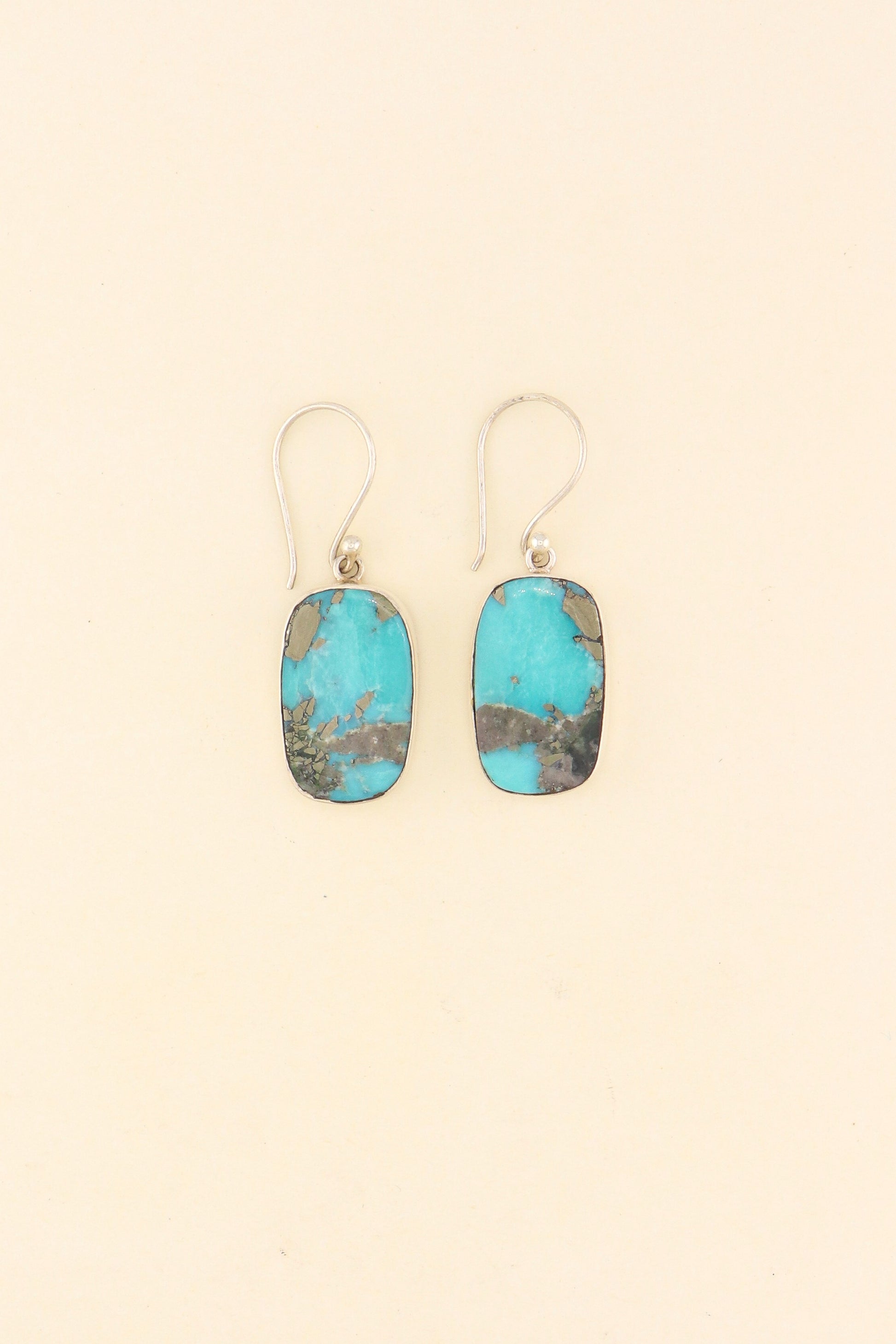 Beautiful Turquoise pair of earrings showing a lovely silver Pyrite pattern. The stones are set with 925 sterling silver.
