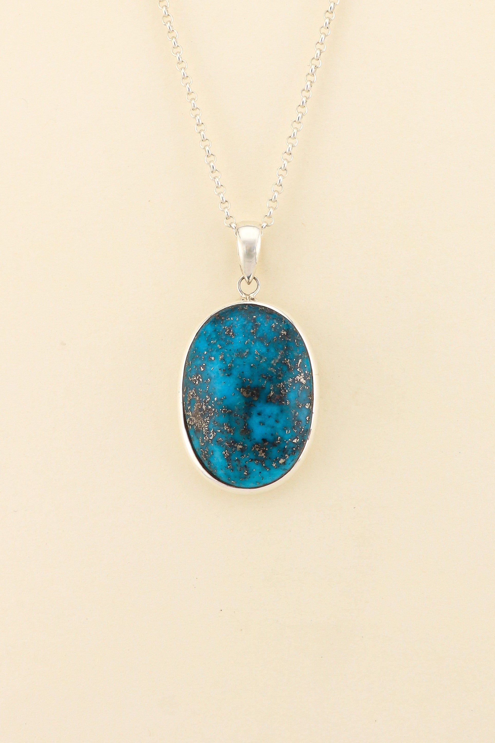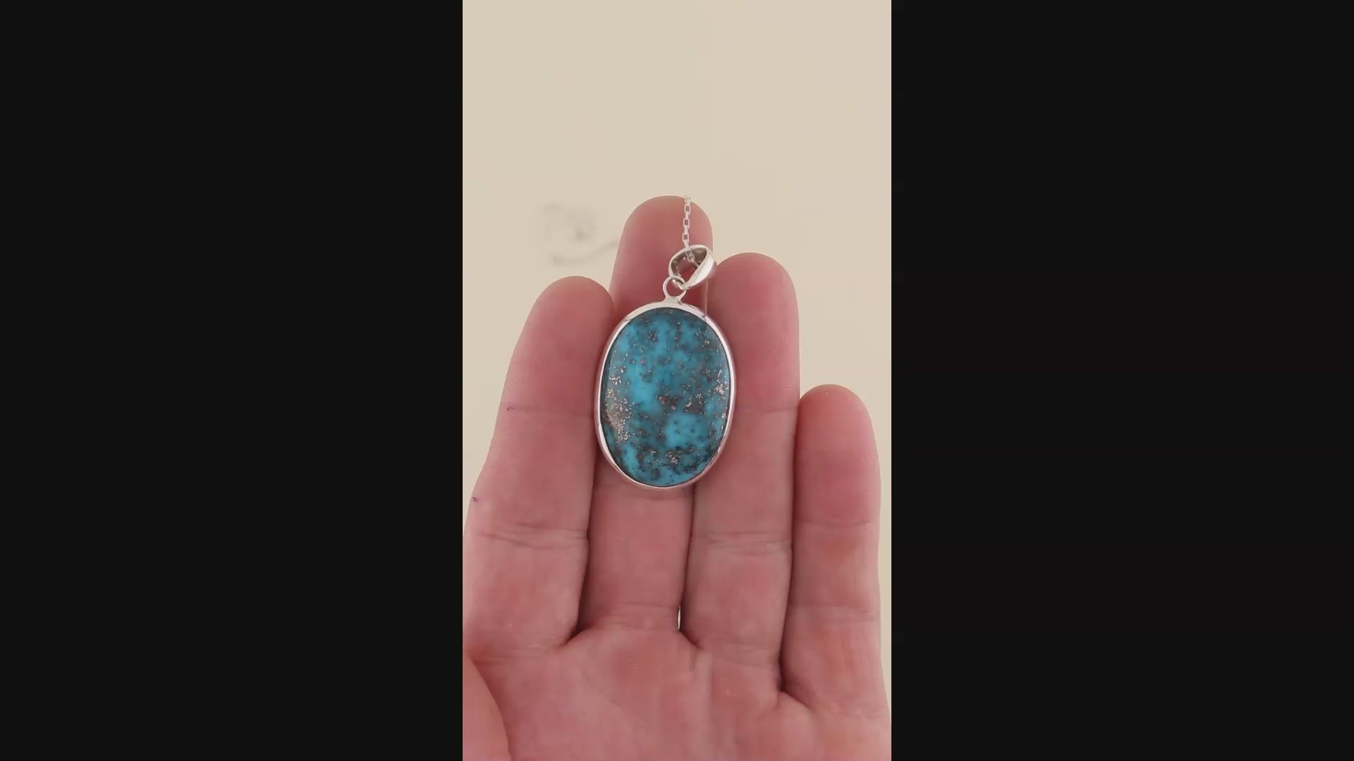 This gorgeous Turquoise with Pyrite speckles makes a lovely pendant. The stone is set with 925 sterling silver.