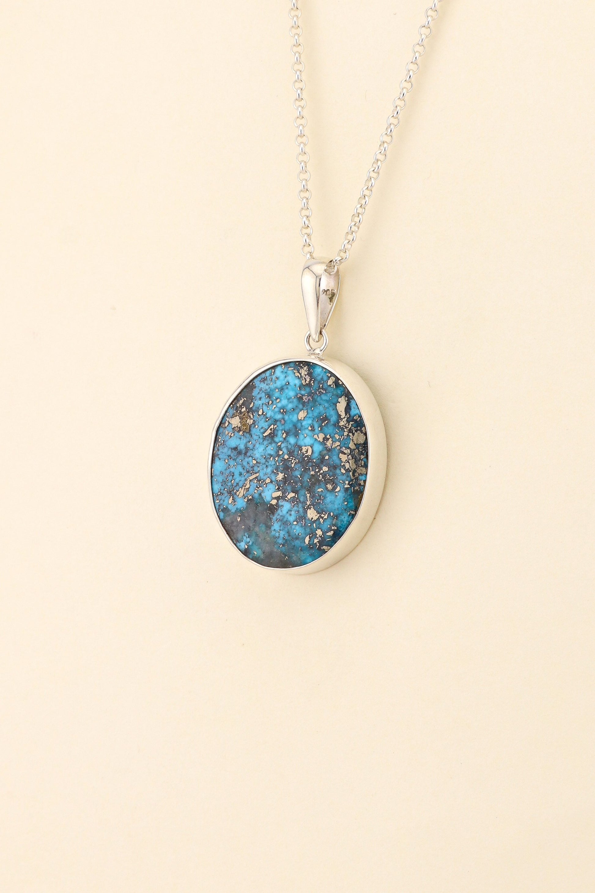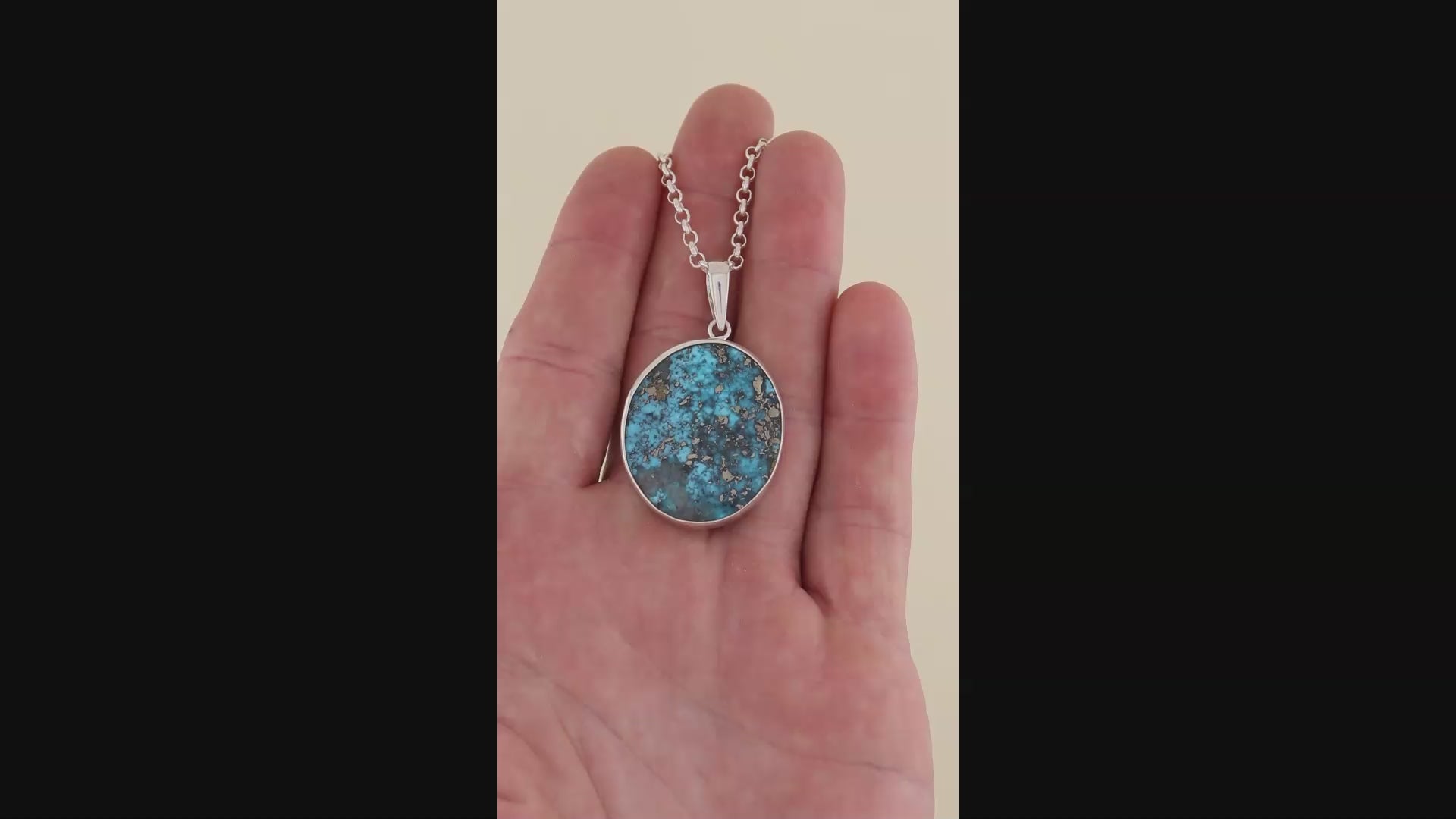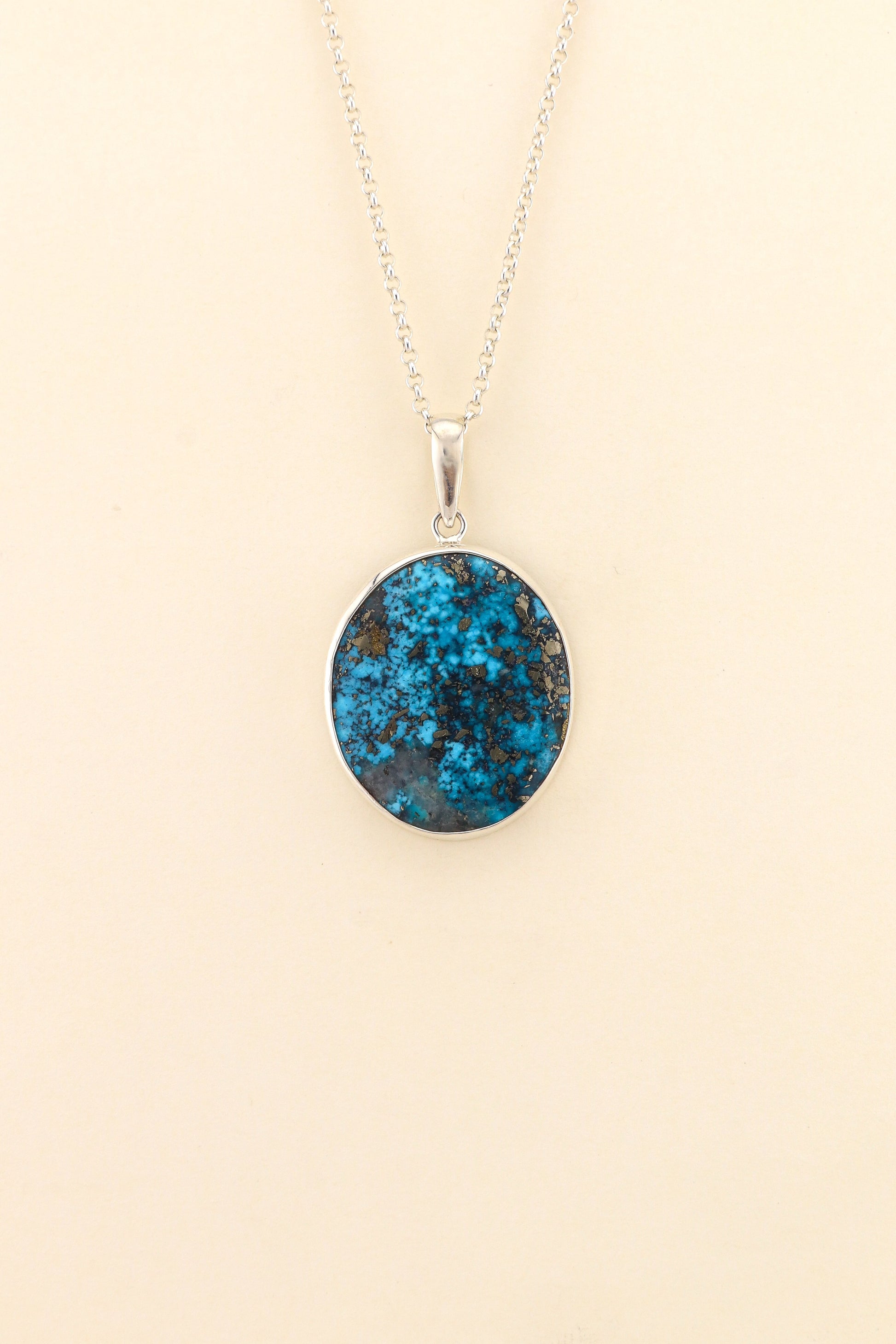 This gorgeous Turquoise shows a mesmerizing Pyrite pattern. The stone is set on a 925 sterling silver bezel.
